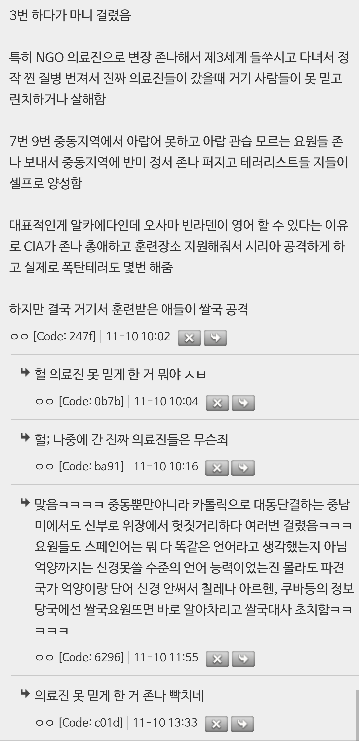 아프간에도 돈 많이 썼는데 쟤들이 부정부패 심해서 우리 돈 너무 많이 쏟았음! 하고 내빼고 ㅋㅋㅋ (부정부패가 없단게 아니라 문화권에 대한 이해부터 잘못함) 오사마 빈 라덴 사살하던 넵튠 작전 직전에도 의료진 꼬드겨서 그동네 애들 예방접종하면서 dna 빼돌렸고 그랬으면 숨기기나 하지 누설되서 지금 탈레반 애들이 그거 근거로 아프간 애들 접종 안시키는데? ㅋㅋㅋㅋㅋ