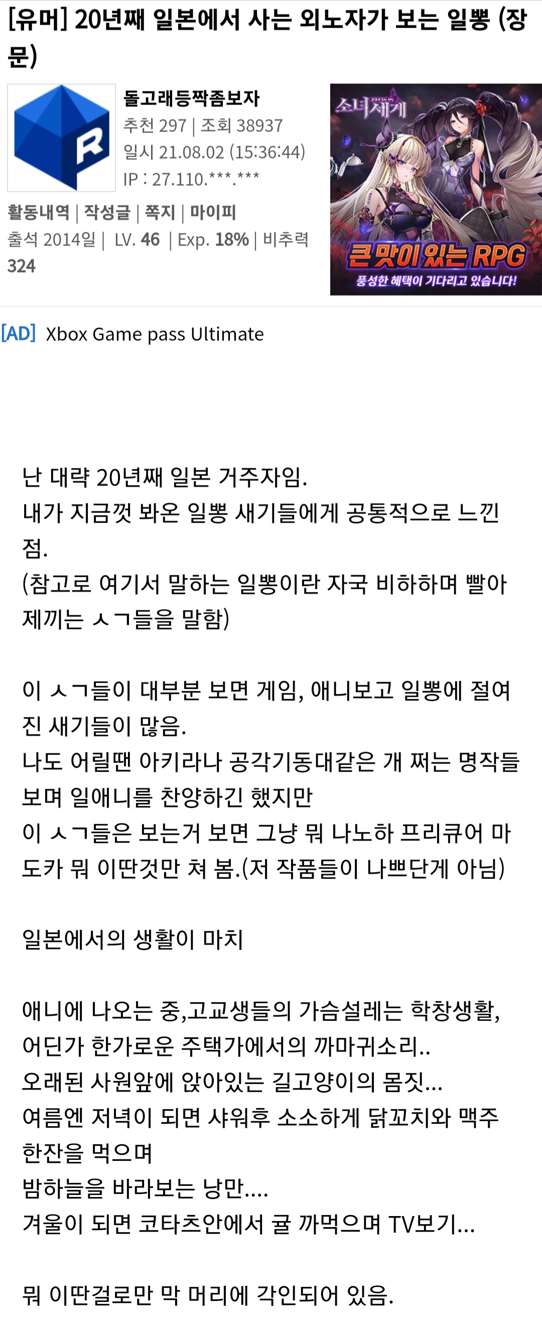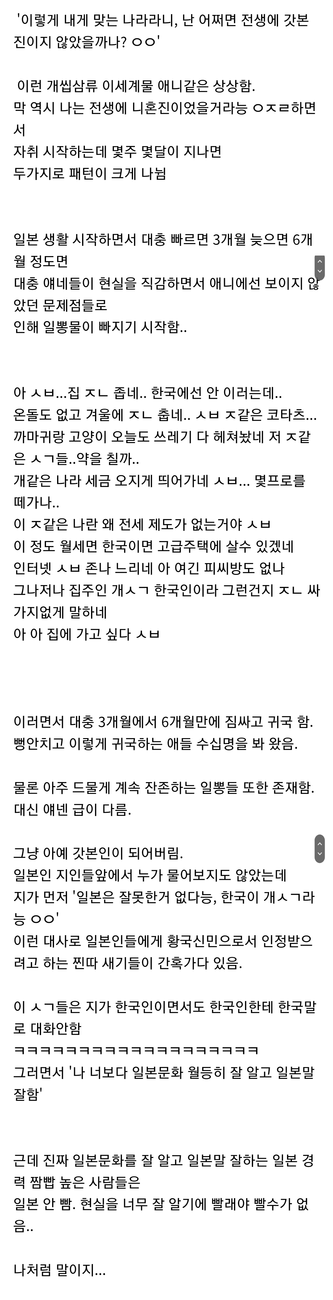 [스크랩] [기타]일본에 오래 거주한 사람이 말하는 일뽕의 현실 작성자INTJ-T|작성시간23.03.07|조회수3,427 목록 댓글 4 글자크기 작게가 글자크기 크게가 다음검색 스크랩 원문 : 쭉빵카페 현재 게시글 추가 기능 열기 북마크 공유하기 신고 센터로 신고 댓글 댓글 4 댓글쓰기 답글쓰기 댓글 리스트 작성자갤럭시노트 | 작성시간 23.03.07 계속 잔존하는 일뽕들은 왜 그런거지? 그 생활이 잘 맞나?ㅋㅋㅋㅋ 작성자불타는에이스 | 작성시간 23.03.07 그...만화작가...생각난다..... 작성자JIGUIN | 작성시간 23.03.07 아니 그냥 뽕에 쳐 취하든말든 거기서 걍 살아 제발 작성자이게맏다 | 작성시간 23.03.07 존나 븅신같음 댓글 전체보기
