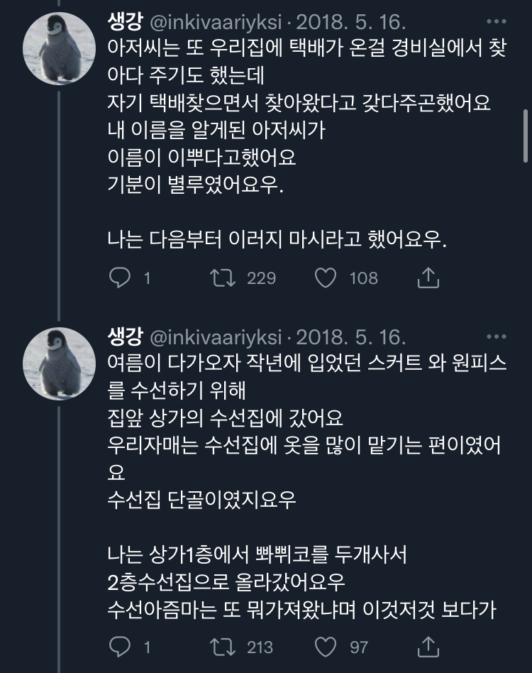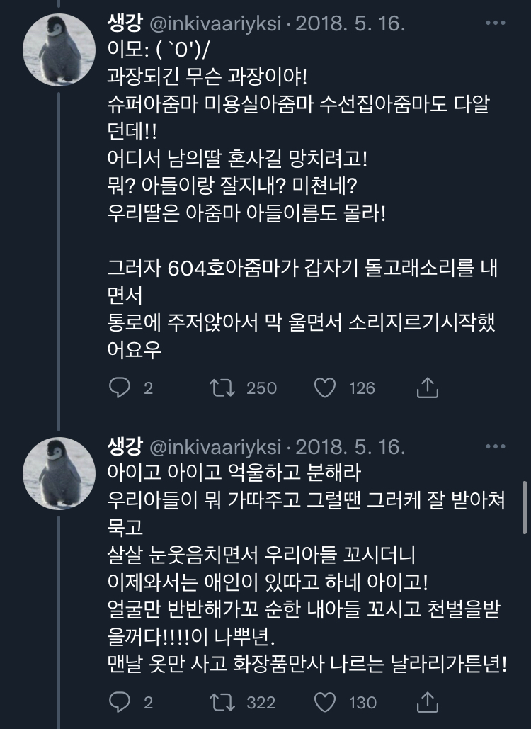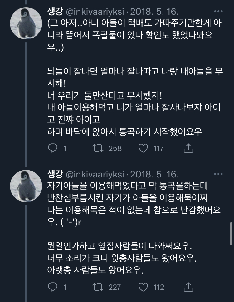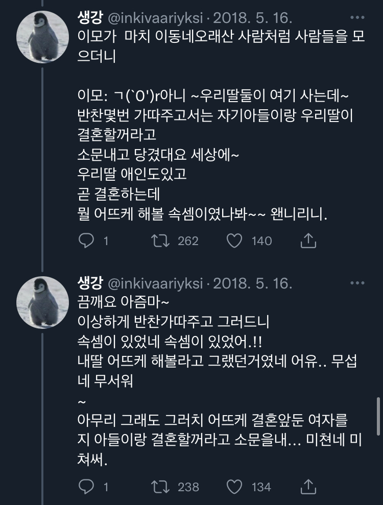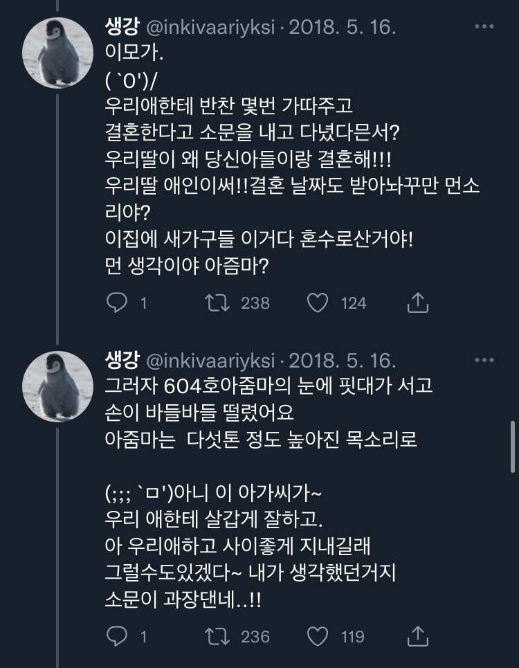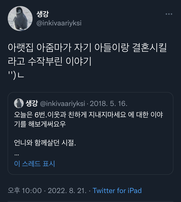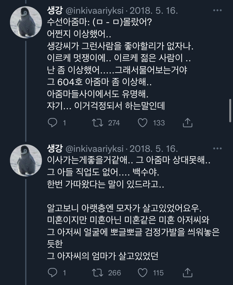 [스크랩] [칵.cxxxx]아랫집 아줌마가 자기 아들이랑 결혼시킬라고 수작부린 이야기 .twt 작성자보카바이블|작성시간23.03.09|조회수11,296 목록 댓글 20 글자크기 작게가 글자크기 크게가 출처 : https://twitter.com/inkivaariyksi/status/1561337539914477568?s=21&t=J_eCBD9JqC2T_NcthPTEDg트위터에서 즐기는 생강“아랫집 아줌마가 자기 아들이랑 결혼시킬라고 수작부린 이야기 '')ㄴ”twitter.com말투는 이분 트위터 말투이므로 언급❌부탁해 다음검색 스크랩 원문 : *여성시대* 차분한 20대들의 알흠다운 공간 현재 게시글 추가 기능 열기 북마크 공유하기 신고 센터로 신고 댓글 댓글 20 댓글쓰기 답글쓰기 댓글 리스트 작성자포기할게 | 작성시간 23.03.09 욕나오네 작성자골져쓰한 골골송 | 작성시간 23.03.09 미쳤다는 말이 약해서 말이 안 나와.. 작성자인사혁신처 | 작성시간 23.03.09 미친.... 토나와 작성자우주대스타ㅎ | 작성시간 23.03.09 아씨발 개토나오네 ㅡㅡ 작성자푹자고싶어 | 작성시간 23.03.09 불쌍하다 정말 왜 그러고 사나 댓글 전체보기