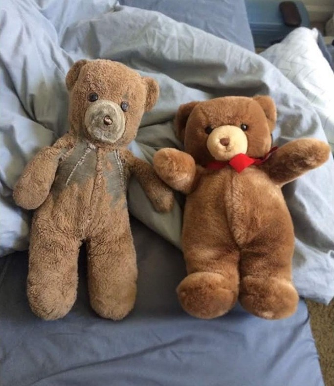 똑같은 인형을 산 엄마가 1985년 아들에게 준 인형과 새로 태어난 손주에게 줄 인형을 창고에서 꺼내서 나란히 둔 모습