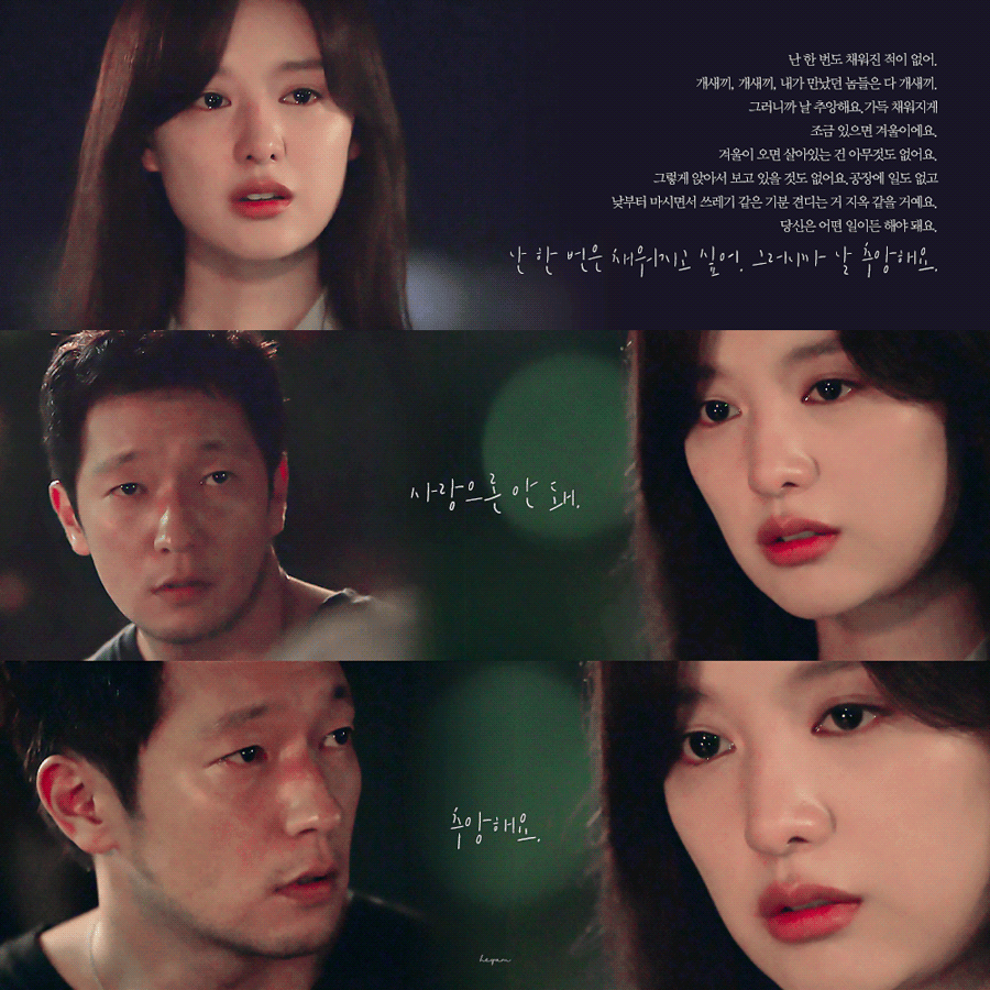 여자는 남자가 떠난 이후에도 어디에 있는지도 모를 남자를 계속 사랑하고 응원하기로 한다. 감기 한 번 걸리지 않기를. 매일 술을 마시던 그에게 숙취가 찾아오지 않기를. 처음부터 그렇게 하기로 정하고 사랑했으니까. 개새끼, 내가 만났던 남자들은 다 개새끼라던 그녀는 지금까지 스스로를 비참한 여자로 몰아세웠다. 우리는 모두 자신이 받은 상처에 대해 어떤 증명과 설명을 원하니까. 그들이 더욱 확실한 개새끼임을 증명하려면 나는 비참해야만 했다. 하루에 최소 5분은 있었을 설렘을 외면하고 내게 남은 것은 오직 ‘썩은 물이 도는 느낌’, 끊임없이 별로가 되는 내 자신과 삶이었던 것이다.