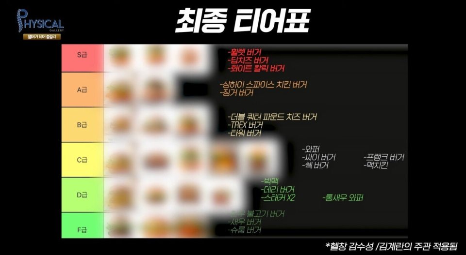 [기타]김계란 선정 햄버거 티어표.jpg 작성자(본인닉네임)테디베어|작성시간23.03.10|조회수62,062 목록 댓글 37 글자크기 작게가 글자크기 크게가 출처 : 여성시대 (본인 닉네임)테디베어 다음검색 현재 게시글 추가 기능 열기 북마크 공유하기 신고 센터로 신고 댓글 댓글 37 댓글쓰기 답글쓰기 댓글 리스트 작성자이름도귀여워굴레 | 작성시간 23.03.10 감자튀김 왜요 작성자까만양배추 | 작성시간 23.03.10 더쿼파가 비급이라니 니가 뭘 안다고 작성자체공녀 강주룡 | 작성시간 23.03.10 화갈 개존맛 작성자모노아민 | 작성시간 23.03.10 와퍼가 B급인것도 말 안된다고 하면서 아래 봤더니 통새우와퍼 C급? 진짜 미각이 잘못된 맛알못이네 작성자마늘광공 | 작성시간 23.03.16 빵 대신 노 번으로 야채번 하면 감튀 먹어도 되나요... 댓글 전체보기