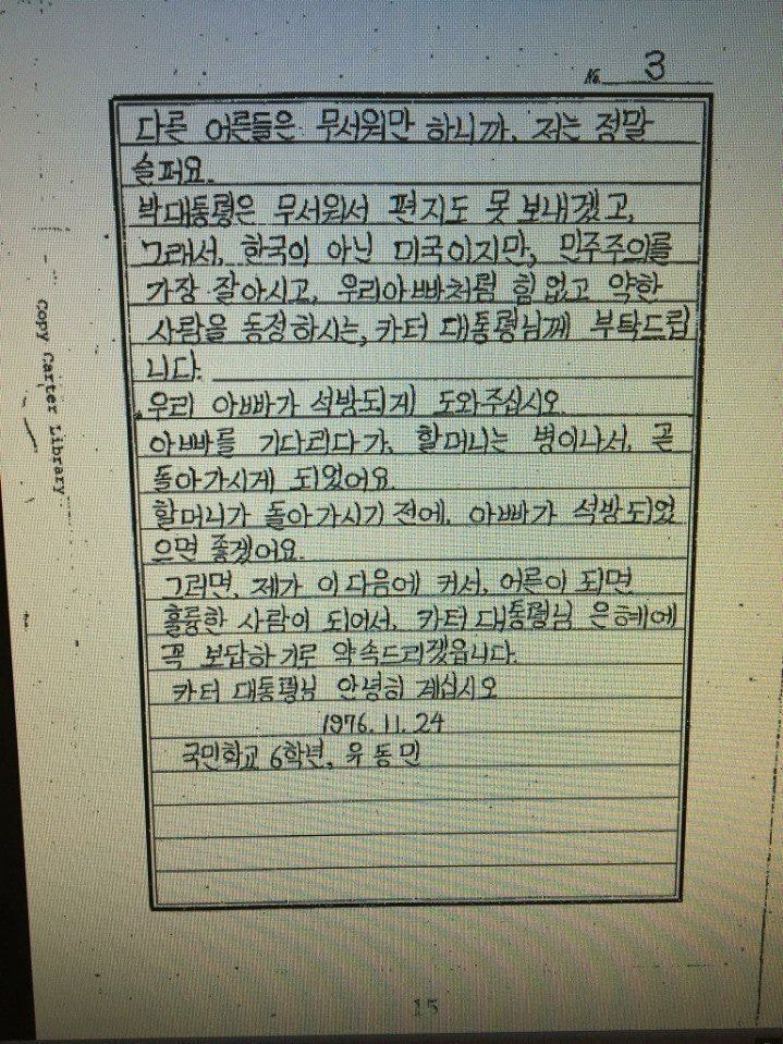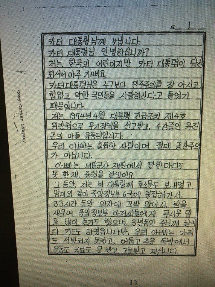 1974년 인혁당 사건 당시 무기징역을 받은 유진곤씨의 아들 유동민씨가 쓴 편지.