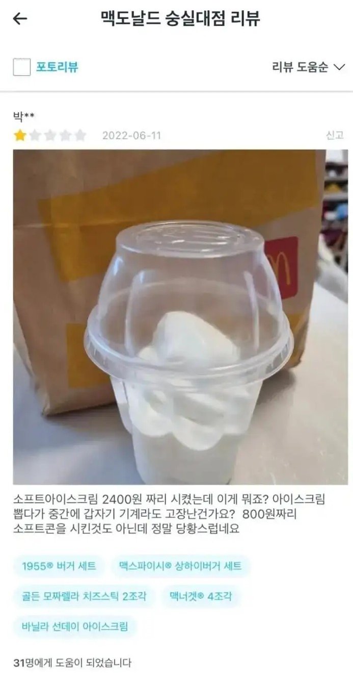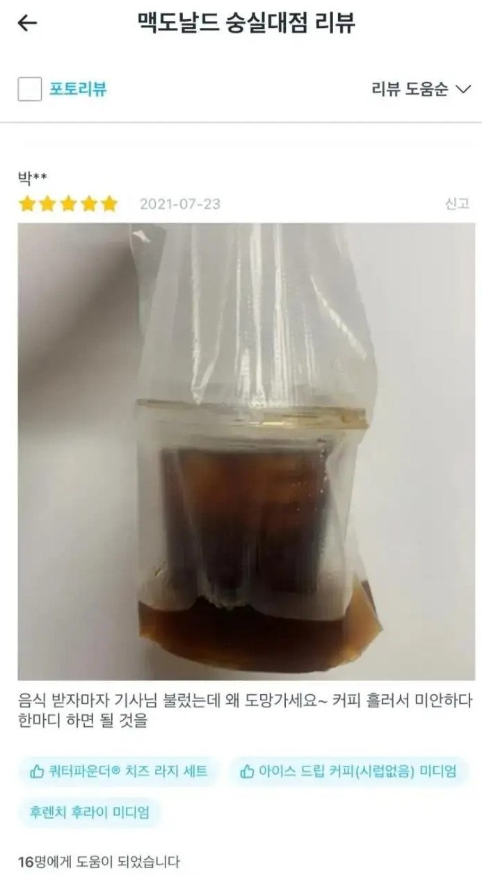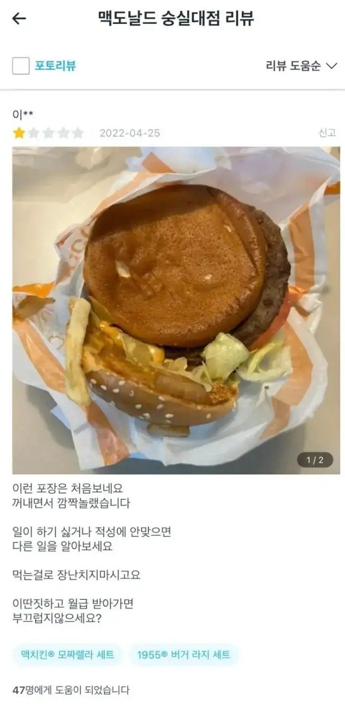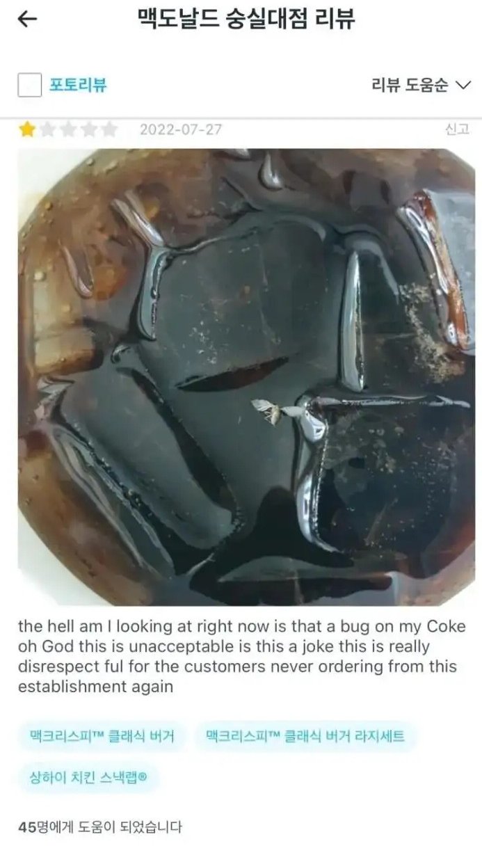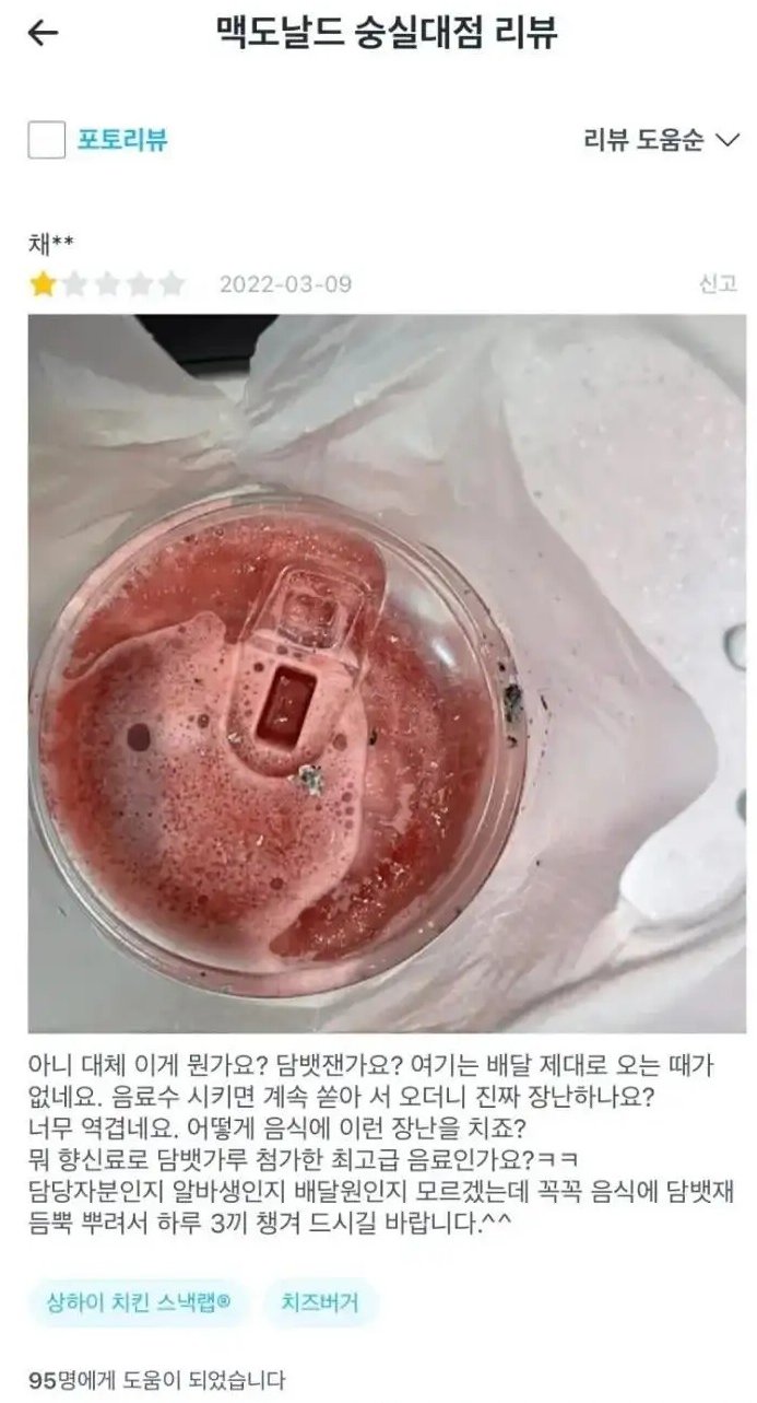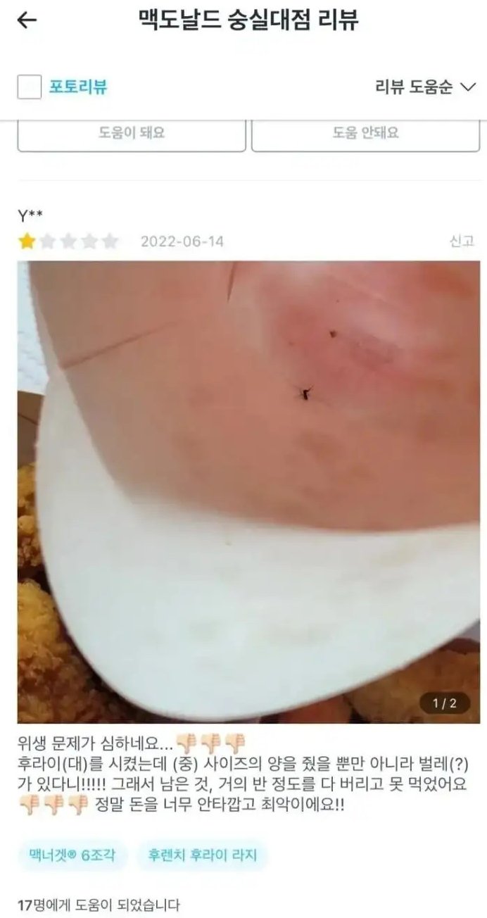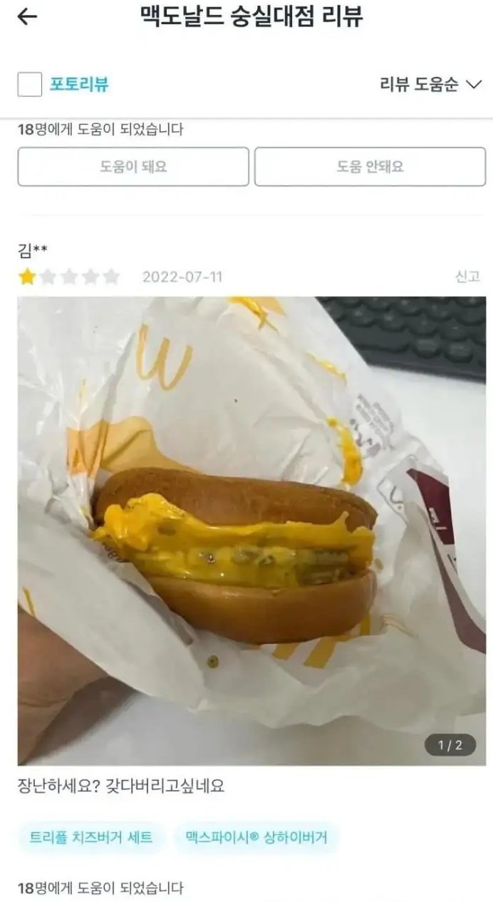 [흥미돋]대환장 맥도날드 숭실대점 리뷰 작성자gabbygabby|작성시간23.03.12|조회수382,591 목록 댓글 32 글자크기 작게가 글자크기 크게가 출처 : 여성시대 gabbygabby아저씨‼️‼️‼️이럴거면 서비스업을 하지마세요‼️‼️‼️‼️‼️‼️‼️ 다음검색 현재 게시글 추가 기능 열기 북마크 공유하기 신고 센터로 신고 댓글 댓글 32 댓글쓰기 답글쓰기 댓글 리스트 작성자까칠햄 | 작성시간 23.03.24 미쳤다 작성자또롱이똘롱 | 작성시간 23.03.24 사회실험하나??? 얼만큼해야지 화를 내나 이런거???? 작성자초밥먹고싶 | 작성시간 23.03.24 엥? 저정도인데 운영이 된다고...? 작성자그저그런개비딸 | 작성시간 23.03.25 너무 더럽다 진심….. 작성자서큘레이터 | 작성시간 23.03.25 배민 저기에만 남길 게 아니라 맥도날드 voc바로 박아야 됨ㄹㅇ 댓글 전체보기