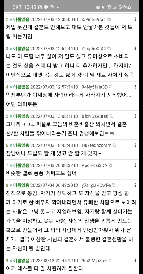 작성자움치기움치기움찻찻 작성시간 23.03.14 ㅈㄴ 어이없어 말끝마나 하.. 내청춘.. 결혼하지마 ㅇㅈㄹ 하길래 듣다듣다 빡쳐서 그정도면 이혼해 소리 절로 나오더라ㅋㅋㅋ 그러면 개정색하는게 아이러니