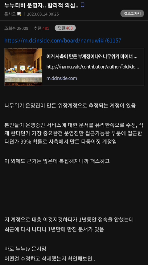 [기타]디시인이 제기한 누누티비 운영자 음모론 ㄷㄷㄷㄷ..JPG 작성자(본인닉네임)문동은|작성시간23.03.14|조회수15,506 목록 댓글 15 글자크기 작게가 글자크기 크게가 출처 : 여성시대 (본인 닉네임)문동은 다음검색 현재 게시글 추가 기능 열기 북마크 공유하기 신고 센터로 신고 댓글 댓글 15 댓글쓰기 답글쓰기 댓글 리스트 작성자어른스럽게말하기 | 작성시간 23.03.14 나무위키는 뭘로먹고살아?? 작성자노났다노났어 | 작성시간 23.03.14 참 대단하다 사람들.... 삭제된 댓글입니다. 답댓글 작성자내일봬요누나 | 작성시간 23.03.14 ㅈㄴㄱㄷ 불법사이트들어가는 것만으로도 갠정보 털리는거지? 들어가려하는 겅 아니고ㅠ 가족들이 저걸로 자꾸 오티티 봐서 한마디하려고 물어보는거 작성자Ll모를 찾아서 | 작성시간 23.03.14 쇼츠에 다 동결건조해먹는 채널인줄 댓글 전체보기