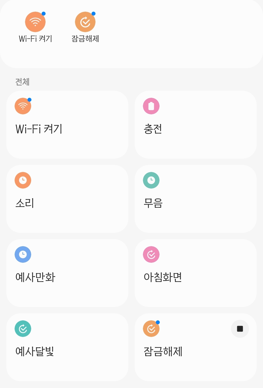 나는 몇개없는디 wifi는 걍 데이터에서 와파키면 데이터 꺼지게 해둔거고 충전은 95퍼 되면 충전 멈추게 해둔거(완충하는거 안좋다길래) 소리랑 무음은 밤엔 무음되게+아침엔 소리켜지게 해둔거고 예사만화랑달빛은 출첵하고 이벤트 체크하느라 특정 시간되면 예사앱 열리게 해둔거고 아침화면은 일어나자마자 폰보면 넘 눈부셔서 ㅋㅋㅋㅋ 화면밝기 낮춰둔거 기상시간 10분후쯤에는 원래밝기로 돌아와 잠금해제는 지문인식 매번해서 잠금해제하는거 싫어서 걸어둔거 이게 루틴중에 젤좋아 이외에 삼페쓰면 자동으로 데이터 연결도 해놨다가 요샌 밖에서 계속 데이터만 써서 필요없어서 없앴어