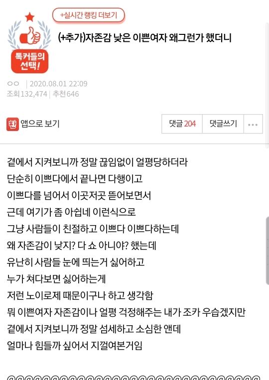 작성자소녀누누 작성시간 23.03.24 차라리 못생기면 조심스러워 하면서 외모적인 얘기 안 하는데 예쁘면 더 평가 오져