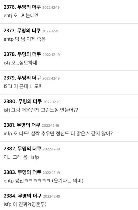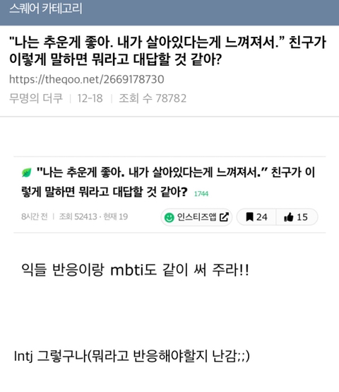 [흥미돋]"나는 추운게 좋아. 내가 살아있다는게 느껴져서.” 친구가 이렇게 말하면 뭐라고 대답할 것 같아? 작성자cool kids never die|작성시간23.03.26|조회수21,437 목록 댓글 867 글자크기 작게가 글자크기 크게가 출처 : https://theqoo.net/square/2669178730 다음검색 현재 게시글 추가 기능 열기 북마크 공유하기 신고 센터로 신고 댓글 댓글 867 댓글쓰기 답글쓰기 댓글 리스트 작성자닮은상근 | 작성시간 23.03.27 Infp 왜왜ㅠㅠ 다른 날들은 살아있는거 같지 않아? 요즘 힘든일 있어?? 작성자쌍문동몽지 | 작성시간 23.03.28 인팁. 왜 그게 무슨 느낌인데 작성자헐ㄹㄹㄹㄹ | 작성시간 23.03.28 잇프피 더울때도 그런 느낌이 나? 작성자genie._. | 작성시간 23.04.11 istp 추운거랑 살아있는게 느껴지는거랑 무슨상관이야? 작성자새우새우새우우새 | 작성시간 23.04.19 esfj 너 건강하다 댓글 전체보기