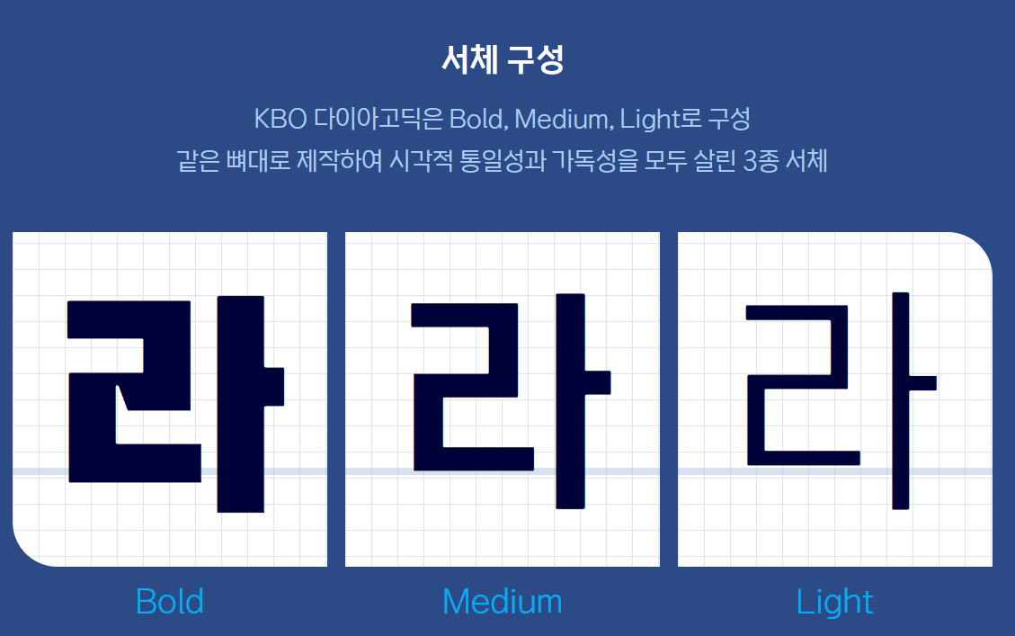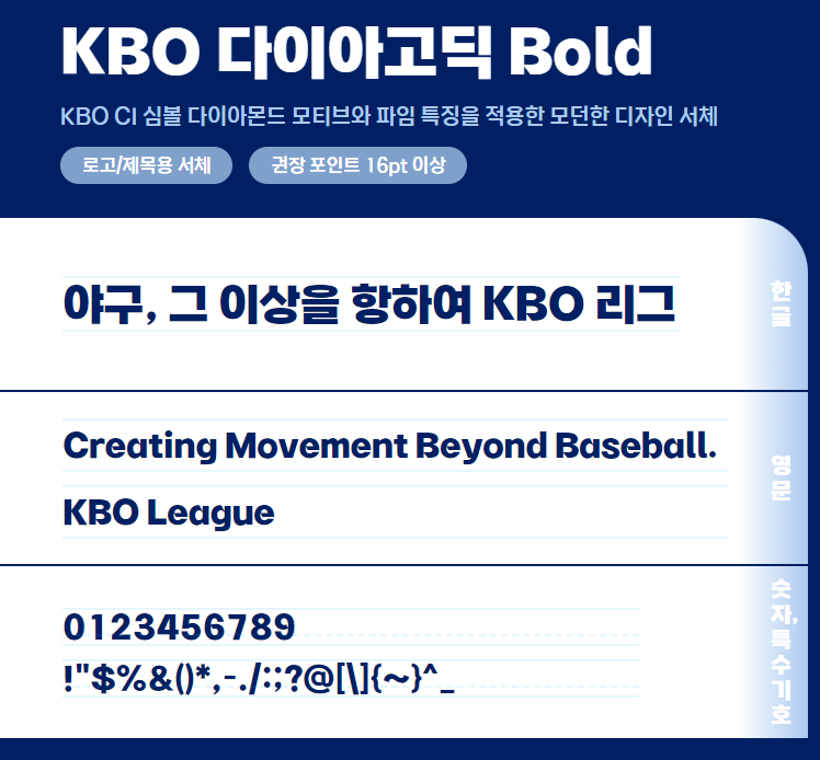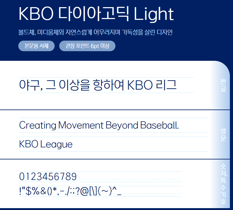 KBO 홈페이지를 통해 배포되는 KBO 글꼴은 개인 및 기업 사용자를 포함한 모든 사용자에게 무료로 제공되며 재배포가 가능합니다.