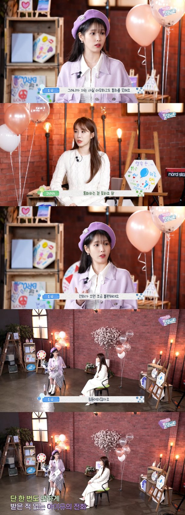 아이유는 "가만히 앉아서 통화를 잘 못한다. 엄마랑 통화를 하더라도 조금 불편하다. 안 불편한 사람은 매니저 오빠다. 워낙 일 얘기를 할 게 많아서 그런 것 같다. 심지어 인나 씨와 통화하는 것도 힘들어한다. 사실 아무하고도 통화를 못한다"며 전화 공포증을 갖고 있음을 알렸다.