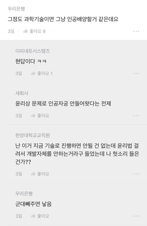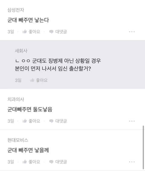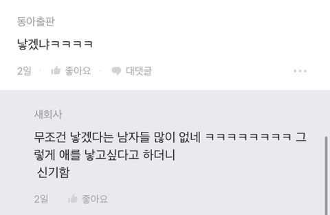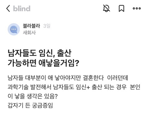 [흥미돋]남자가 임신 가능하면 낳는다 vs 안 낳는다 작성자하난난|작성시간23.04.05|조회수6,064 목록 댓글 43 글자크기 작게가 글자크기 크게가 출처 : 여성시대 하난난때는 203X년…..계속된 저출생으로 인하여 ..정부에서 파격 저출생정책을 발표함그것은 바로 남성임신 도입………! 과학기술의 발전으로 남성도 임신이 가능하게 된 것임………부부 중 여성이 임신할지남성이 임신할지 선택이 가능하게 되어버림 … 다음검색 현재 게시글 추가 기능 열기 북마크 공유하기 신고 센터로 신고 댓글 댓글 43 댓글쓰기 답글쓰기 댓글 리스트 작성자그냥지나가라구 | 작성시간 23.04.05 군대 안갔으면 어쩔뻔 작성자메롱키티 | 작성시간 23.04.05 군대 갈게 낳아 작성자어어어푸푸푸 또 허허허 우우우적 | 작성시간 23.04.05 군대 없으면 진짜 어쩔뻔했냐 작성자좀 찾아봐라 | 작성시간 23.04.05 남자가 애낳는다고 하면 콜이지250에 애 잘 키우고 알뜰하게 내조해줄 남편 괌 작성자광안리뷰 | 작성시간 23.04.05 ㅋㅋㅋㅋ결국 군대ㅋㅋㅋ 댓글 전체보기