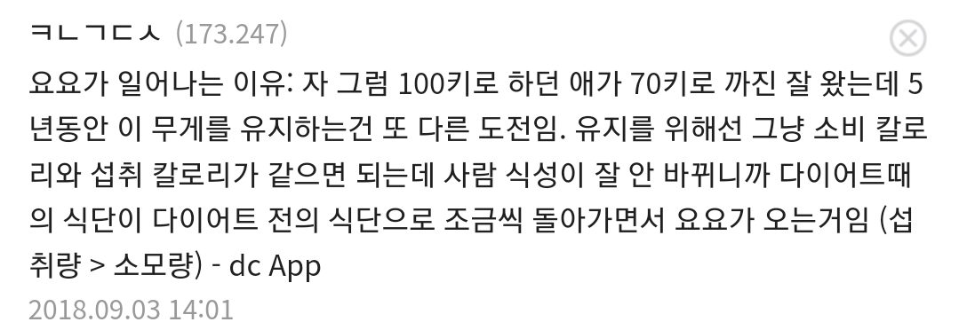 오히려 2700 칼로리 - 2500 칼로리 해서 200 칼로리 오바 해버리기 때문에 같은 식단으로 100키로때 일주일에 1키로 빠지던게 이제 몸무게가 늘어버리는 상황. 그래서 이제 짜장면 대신 스테이크나 채소 곁들인 고기볶음 같은걸로 식단을 바꿔야 하는거임. 다이어트를 하면서 계속해서 식단에 변화도 주고 양을 줄여야 한다는걸 몰라서 사람들이 정체기를 겪는듯