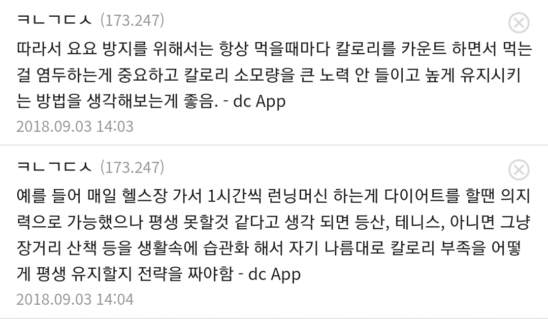 이거 두개만 해도 이제 딱 반은 성공한거. 이제 섭취 칼로리 - 소비 칼로리가 얼마나 마이너스가 되느냐에 따라서 살 빠지는 속도가 결정됌.