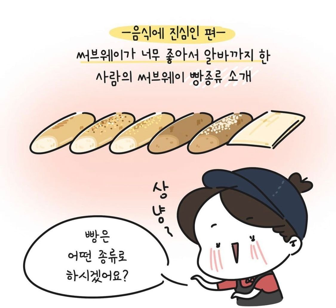 [스크랩] [흥미돋]그림으로 쉽게 설명해주는 서브웨이 빵종류 작성자보카바이블|작성시간23.04.08|조회수15,800 목록 댓글 15 글자크기 작게가 글자크기 크게가 출처 : https://www.instagram.com/p/CZOBEPWv88f/?utm_medium=copy_linkInstagram의 구일일님 : "음식에 진심인 편 (써브웨이2탄!) . . . #그림 #만화 #써브웨이 #써13K Likes, 606 Comments - 구일일 (@9ill1_toon) on Instagram: "음식에 진심인 편 (써브웨이2탄!) . . . #그림 #만화 #써브웨이 #써브웨이메뉴추천 #써브웨이빵 #캐릭터 #샌드위치 #알바 #음식 #음식에www.instagram.com 다음검색 스크랩 원문 : *여성시대* 차분한 20대들의 알흠다운 공간 현재 게시글 추가 기능 열기 북마크 공유하기 신고 센터로 신고 댓글 댓글 15 댓글쓰기 답글쓰기 댓글 리스트 답댓글 작성자일태기가 왔어요 | 작성시간 23.04.08 앗 젤인기많네... 작성자부자가되고싶다요오 | 작성시간 23.04.08 플랫만 팜 작성자햇살같은 | 작성시간 23.04.08 거의 플랫브레드로만 먹어봤는데 다른것도 먹어봐야지 작성자티라미수케잌 | 작성시간 23.04.08 하티 짱좋아해 작성자문구점 | 작성시간 23.04.08 플렛 좋아 댓글 전체보기