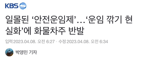 [여시뉴스데스크]일몰된 ‘안전운임제’…‘운임 깎기 현실화’에 화물차주 반발 작성자소리앙|작성시간23.04.08|조회수681 목록 댓글 3 글자크기 작게가 글자크기 크게가 출처 : https://naver.me/5KOzt7fJ일몰된 ‘안전운임제’…‘운임 깎기 현실화’에 화물차주 반발안전운임제가 사라진지 석 달이 지났지만, 여야는 후속 법안을 두고 공방만 벌이고 있습니다. 최저 운임을 결정할 위원회도 꾸리지 못하면서 화주들은 일방적인 운임 삭감을 요구하고 있고 화n.news.naver.com전문출처 다음검색 현재 게시글 추가 기능 열기 북마크 공유하기 신고 센터로 신고 댓글 댓글 3 댓글쓰기 답글쓰기 댓글 리스트 작성자판도라의사장 | 작성시간 23.04.08 차주들 안타깝다.. 운임 보장 안되면 결국 서로 제살깎아먹게 될건데.. 어쩔수없이 과적하는 일도 더 자주 생길거고… 작성자법무능장관의 편의점 탐방기 | 작성시간 23.04.08 갑갑하다... 작성자족발이세요족같으세요 | 작성시간 23.04.09 결국.... 댓글 전체보기