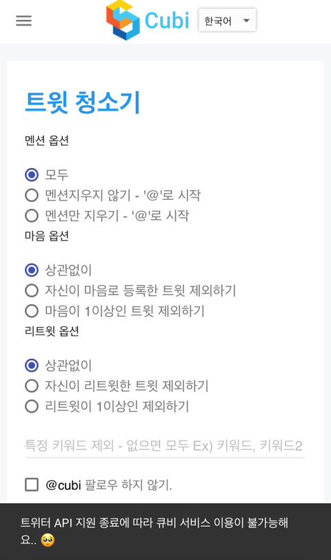 [기타](실시간) 여시들 트위터 청소 이제 불가능한거 앎? 작성자j2mh|작성시간23.04.09|조회수6,329 목록 댓글 4 글자크기 작게가 글자크기 크게가 출처 : 여성시대 j2mh썸네일(다음카페를 예시로 들자면) 큐비 청소사이트란 곳에내 다음카페아이디로 로그인하면글/댓글 싹 지울수 있던거였음그만큼 간편해서 엄청들 많이쓰는 곳이였음근데 트위터 API 지원종료로 이젠 못씀...트위터 계펑하든지 수동으로 하나하나 다 지워야함큐비 못써요...좀전에 해봤는데 역시 안돼 다음검색 현재 게시글 추가 기능 열기 북마크 공유하기 신고 센터로 신고 댓글 댓글 4 댓글쓰기 답글쓰기 댓글 리스트 작성자글렌 파웰 | 작성시간 23.04.09 머.. 머라고요.. 작성자젤링링 | 작성시간 23.04.09 어쩐지 안되더라... 작성자갈무열 | 작성시간 23.04.09 않되!!!!!!!!!!!!!!!! 작성자포항항~ | 작성시간 23.04.09 헐 신기하네,,, 댓글 전체보기