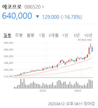 이날 코스닥시장에서 에코프로의 주가는 전 거래일 대비 16.78% 내린 64만원에 거래를 마쳤다.