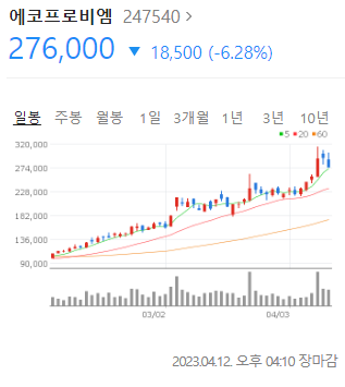 에코프로는 주가 과열 논란 속에서도 전날까지 강세를 지속했으나, 현재 주가가 미래 가치를 뛰어넘었다는 지적이 잇따르자 결국 약세 전환한 것으로 보인다.