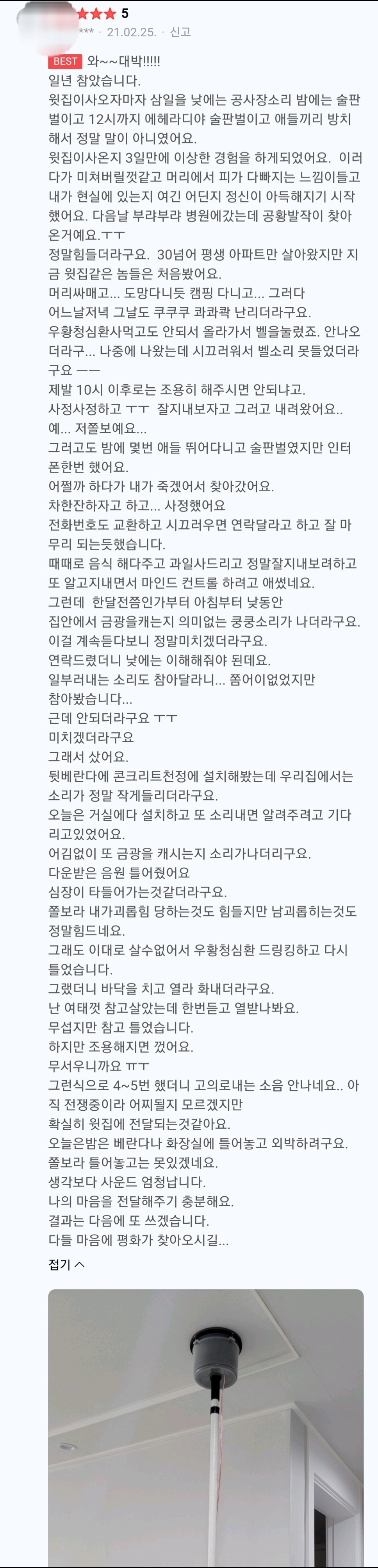 작성자바실리카민스키 작성시간 23.04.14 층간소음땜에 맨날 올라가서 싸우고 지랄함 우퍼 사려고 봣더니 생각보다 너무 비싸길래 이거 사는 사람들은 얼마나 빡치고 힘들까부터 상각하게댐ㅋㅋㅋㅋㅋ