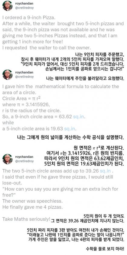 보통 사람들은 "지름의 차이가 2배니까 양도 그만큼 차이가 나겠지"라고 생각하지만 미디엄 피자와 라지 피자의 넓이는 각각 314㎠, 1,256㎠로 약 4배 정도 차이가 난다.