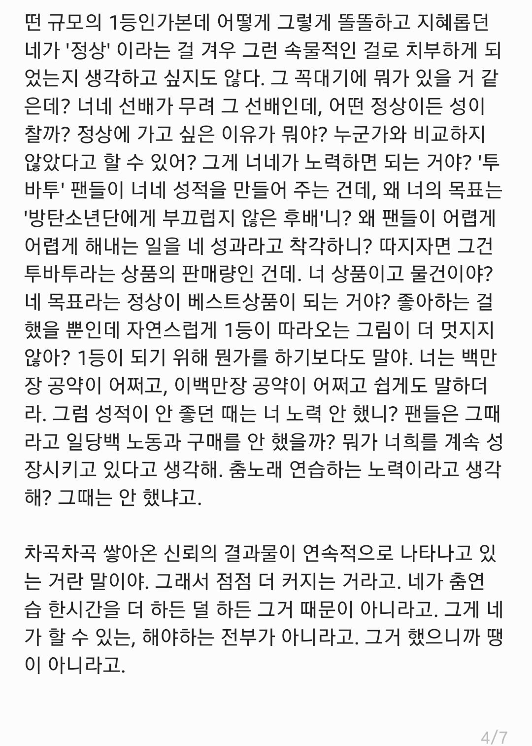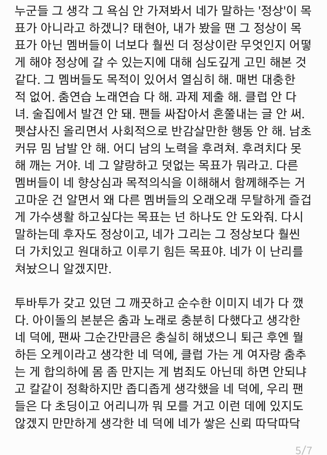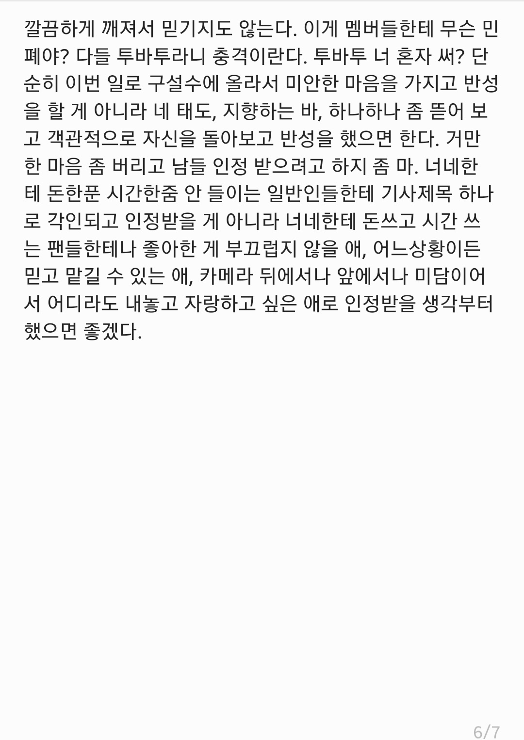 보는데 ㄹㅇ 정성스럽고 진심이다... 투바투 팬 아니어도 읽는데 공감되고 좀 깊게 생각하게 하는 글임ㅋㅋㅋ 전에 핫플난 탈덕 조롱글 보다 이게 꼭 그 빨간조명 클럽남에게 도달했음 좋겠네