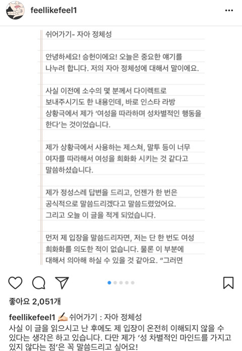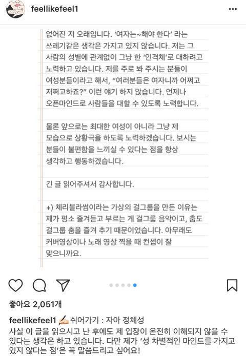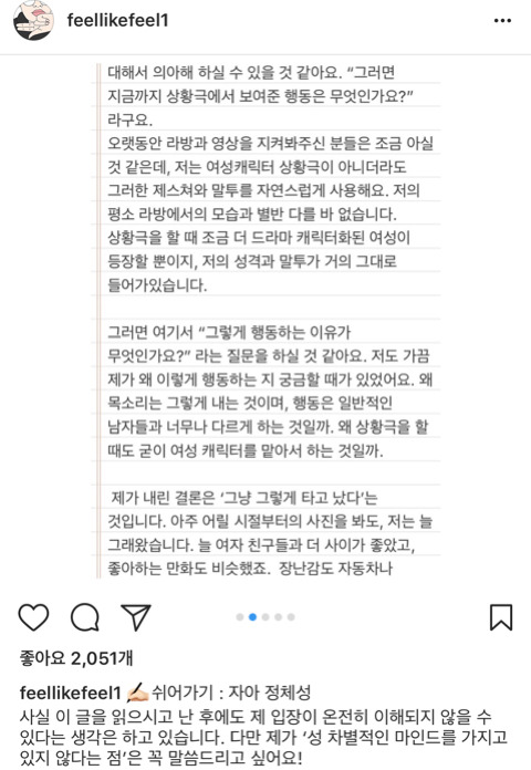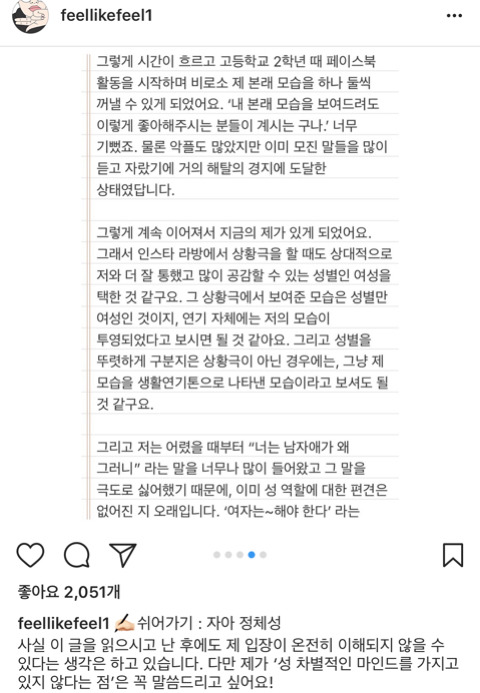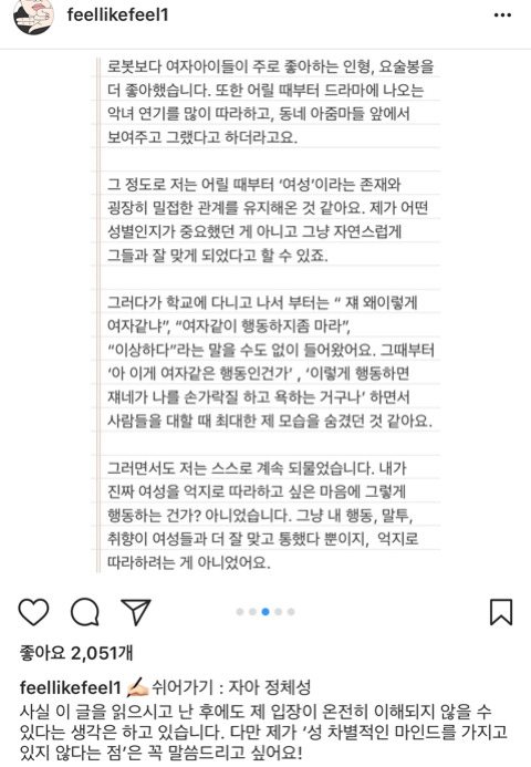 작성자솔방올 작성시간 23.04.16 여자 남자로 가르는게 아니라 더 편한 행동 좋아하는 대상을 갖는거지 뮤ㅓ… 애초에 성차별이 없었다면 트젠도 없었을거라 생각함… 걍 동성을 좋아할 수도 있는거고 옷도 치마니 바지니 구애 없이 좋아하는 끌리는 걸 택할 뿐… 갈라둔 기준이 더 몰두하고 집착하게 만드는 것 같음… 솔직히 승헌이는 걍 리액션이나 행동에 에너지가 넘치고 발랄한거지 저런 방향을 여자 같은 행동으로 제한두는게 더 웃기셩