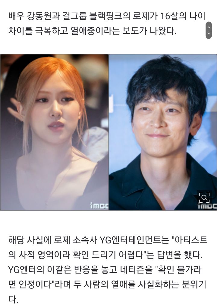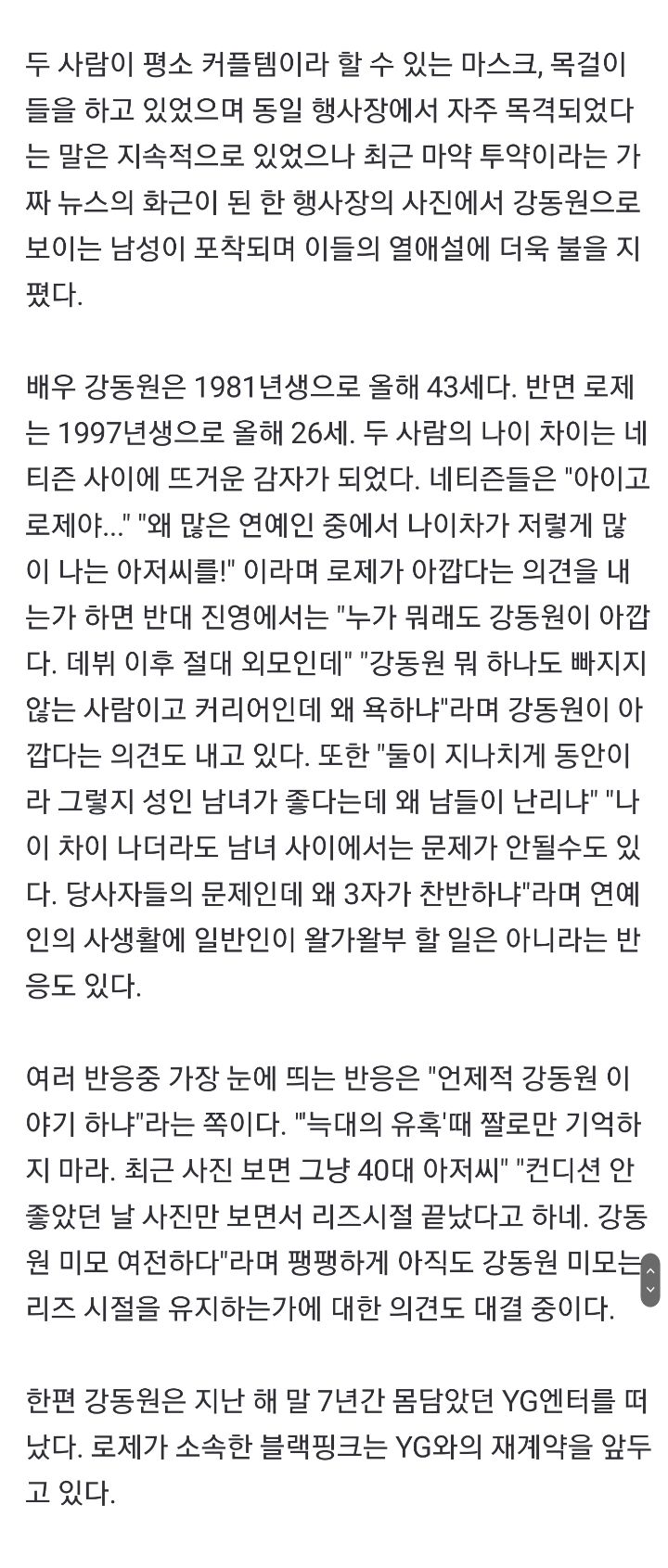 [여시뉴스데스크]강동원♥로제, 16살 차이 열애설에 네티즌 '강동원은 40대 아저씨' 놓고 갑론을박 [이슈in] 작성자쓰레긱|작성시간23.04.17|조회수72,366 목록 댓글 574 글자크기 작게가 글자크기 크게가 출처 : https://n.news.naver.com/entertain/article/408/0000186011강동원♥로제, 16살 차이 열애설에 네티즌 '강동원은 40대 아저씨' 놓고 갑론을박 [이슈in]배우 강동원과 걸그룹 블랙핑크의 로제가 16살의 나이 차이를 극복하고 열애중이라는 보도가 나왔다. 해당 사실에 로제 소속사 YG엔터테인먼트는 "아티스트의 사적 영역이라 확인 드리기 어렵다n.news.naver.com 다음검색 현재 게시글 추가 기능 열기 북마크 공유하기 신고 센터로 신고 댓글 댓글 574 댓글쓰기 답글쓰기 댓글 리스트 작성자난으릉이다 | 작성시간 23.04.17 민영화에더 신경쓰자!!!!!!언제까지 연예인으로 덮을꺼냐!!! 작성자대한민국은 김연경보유국이다 | 작성시간 23.04.17 민영화?!!!!! 작성자그만두고시퍼 | 작성시간 23.04.17 민영화반대 작성자뽀빙 | 작성시간 23.04.18 관심없고 민영화요 작성자계상 부인 | 작성시간 23.04.18 ㅋㅋㅋㄱㅋㅋㅋ 댓글 전체보기