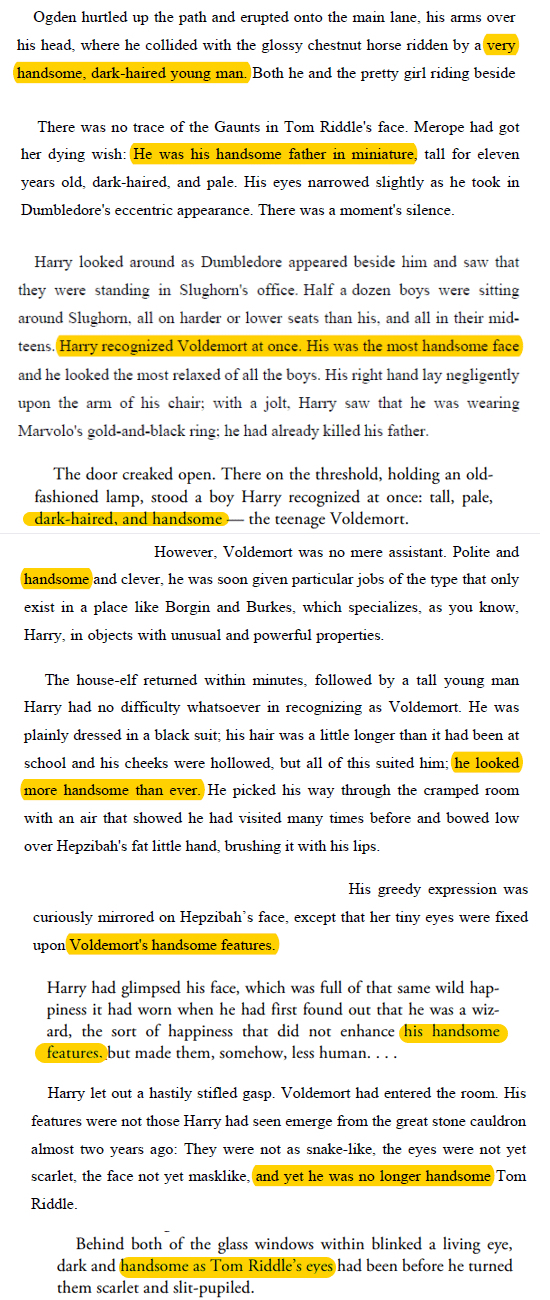 (원문은 롤링여사의 톰 리들(=볼드모트) 외모묘사... 핸썸을 빼놓지 않은...)