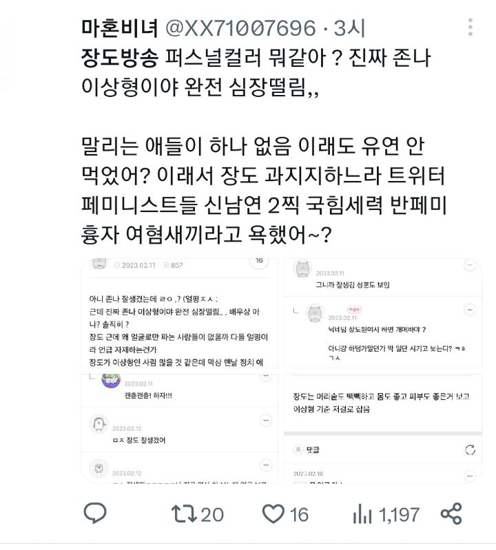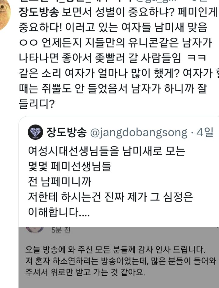 조롱하는 합성짤 계정있는데 이 계정이 지가 페미라서 장도가 적절치 못해서 팬다해놓고 그전에 하던짓도 탈코페민데 진보성향이라고 여성페미싸불한 거
