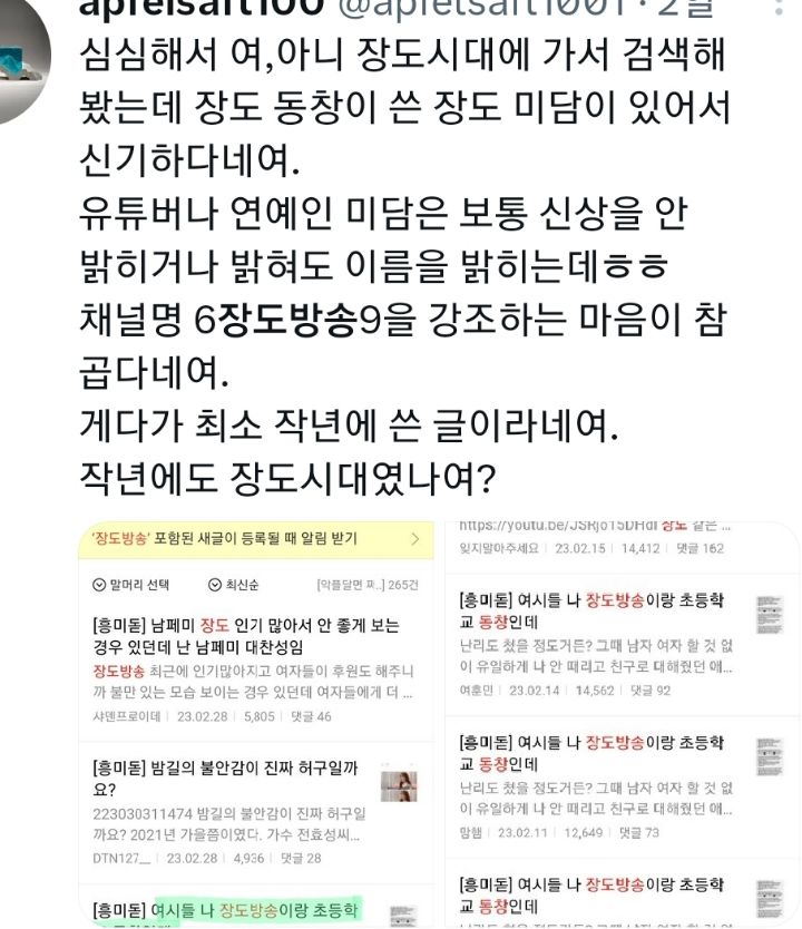 최근 자매님과 방송한 장도방송인데 조회수 삼백 ㅋ