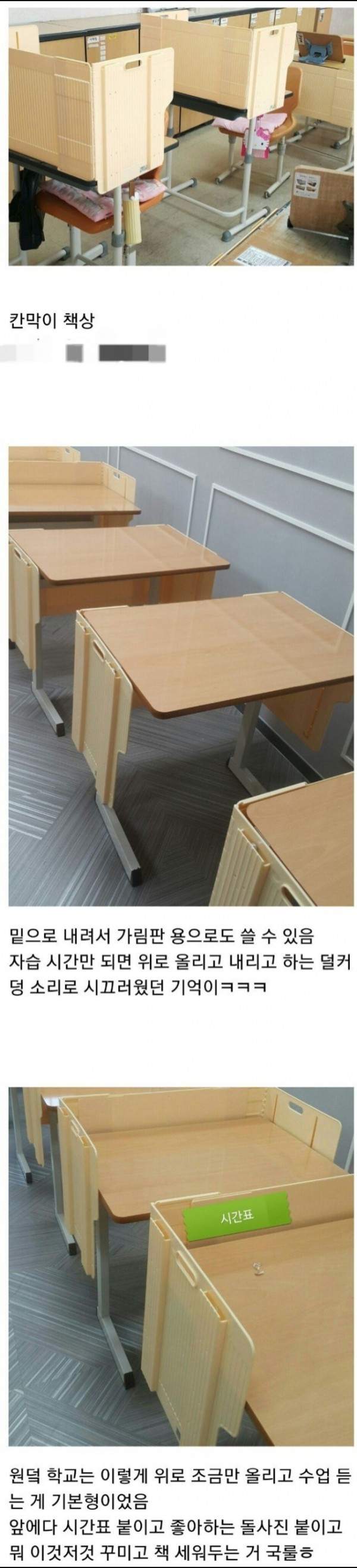 작성자고구마빵 작성시간 23.04.20 라떼는 철로 된 다리에 나무판 책상이 국룰이었는데....???? 저게 뭔데 담요 필수야,,,,,