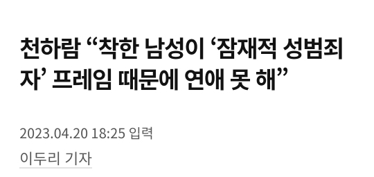 작성자내이름은유난떨고있죠 작성시간 23.04.21 잠재적범죄자 프레임이 싫으면 그런 편견을 만들어낸 기존 남범죄자들을 탓해야지 왜 여자탓을 해 빡대갈아