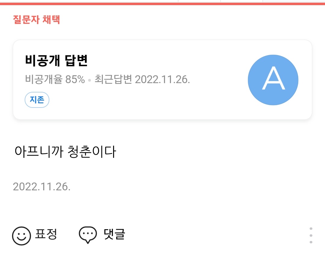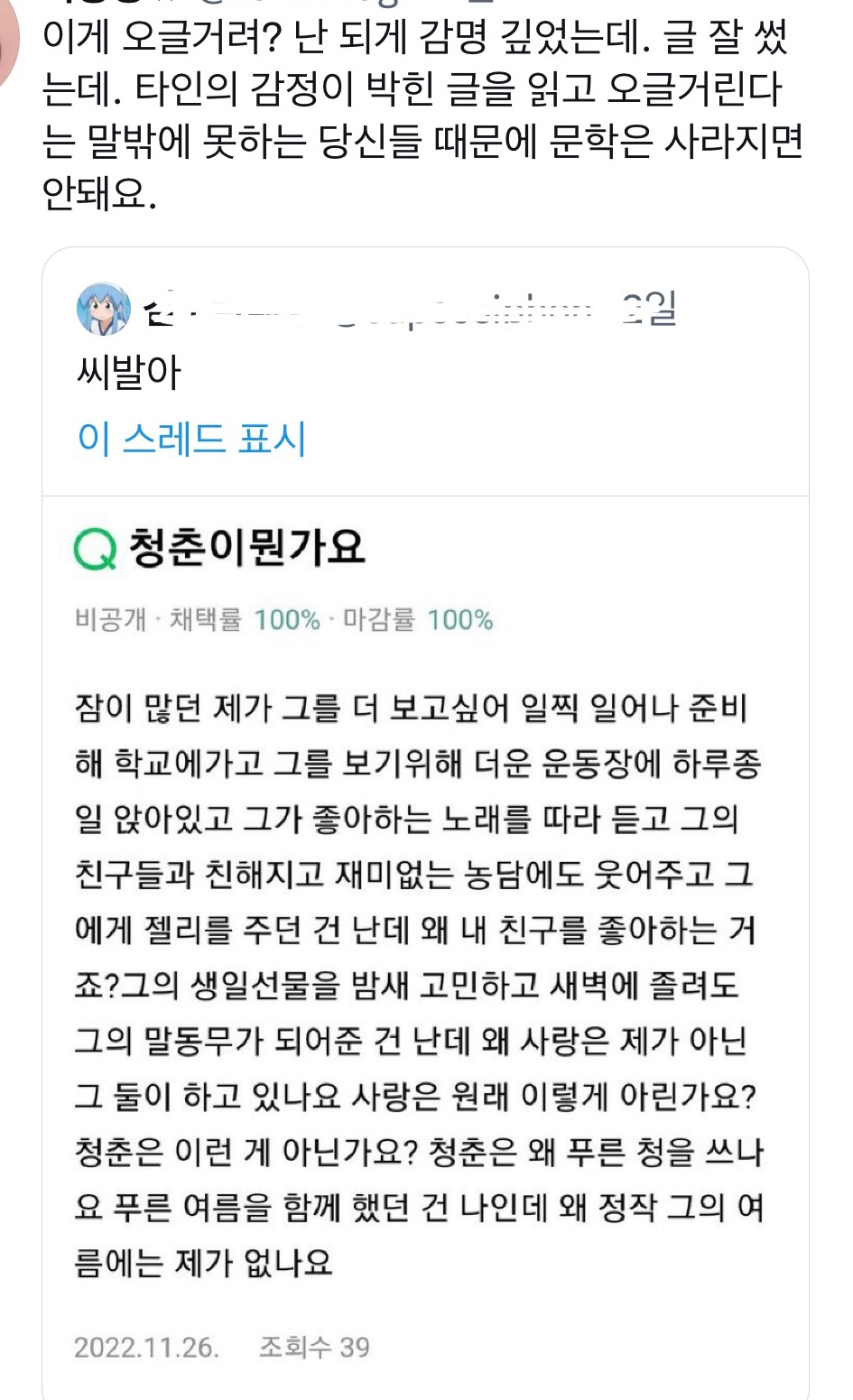 작성자집좀보냐줘; 작성시간 23.04.21 자기 마음 글로 표현하는 것도 능력이야 멋있어 그림 그리는 사람들한테는 오글거린다고 잘 안 하면서 왜 글한테만 이렇게 박한 거지 사람들은?
