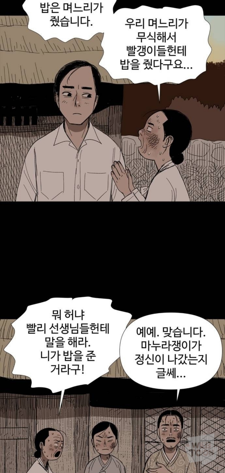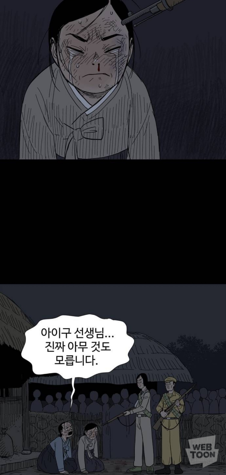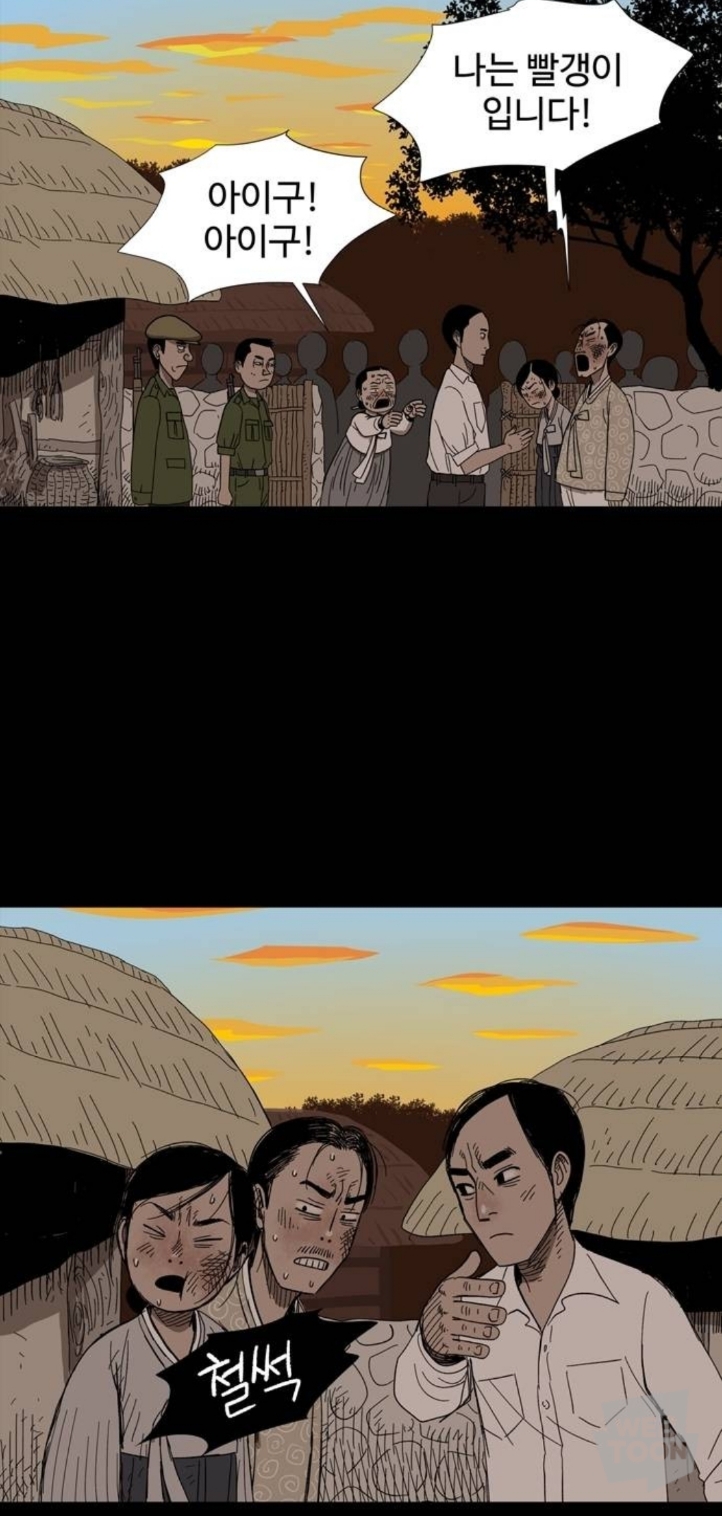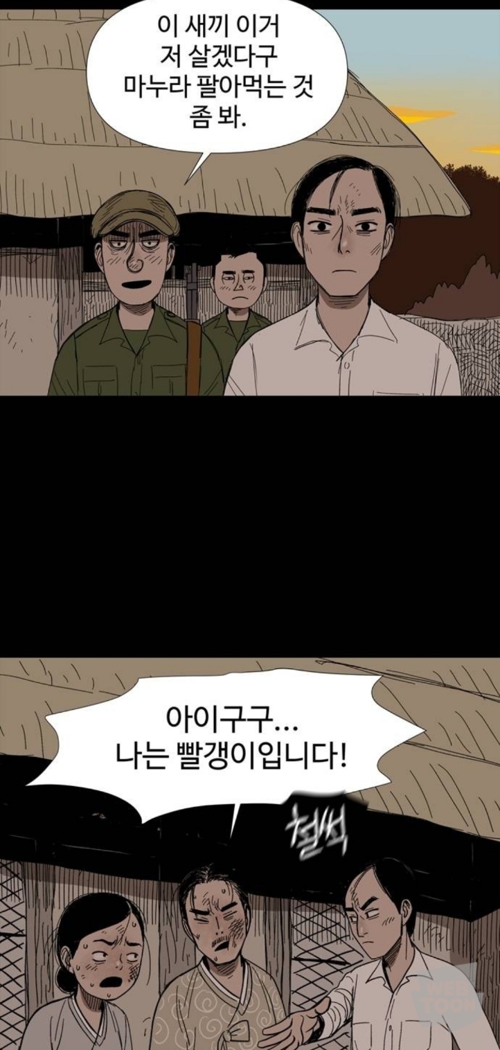 마을에 내려온 북한군에게 밥을 줬다는 이유로 남한군에게 창피당하는 중임