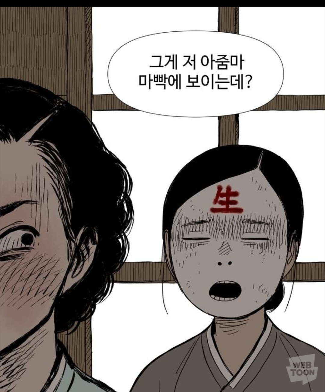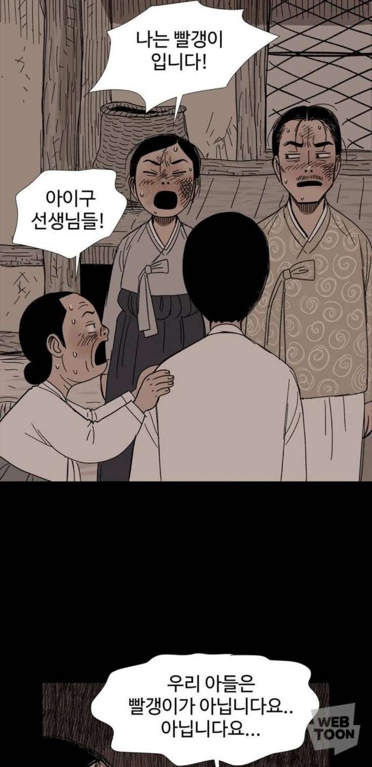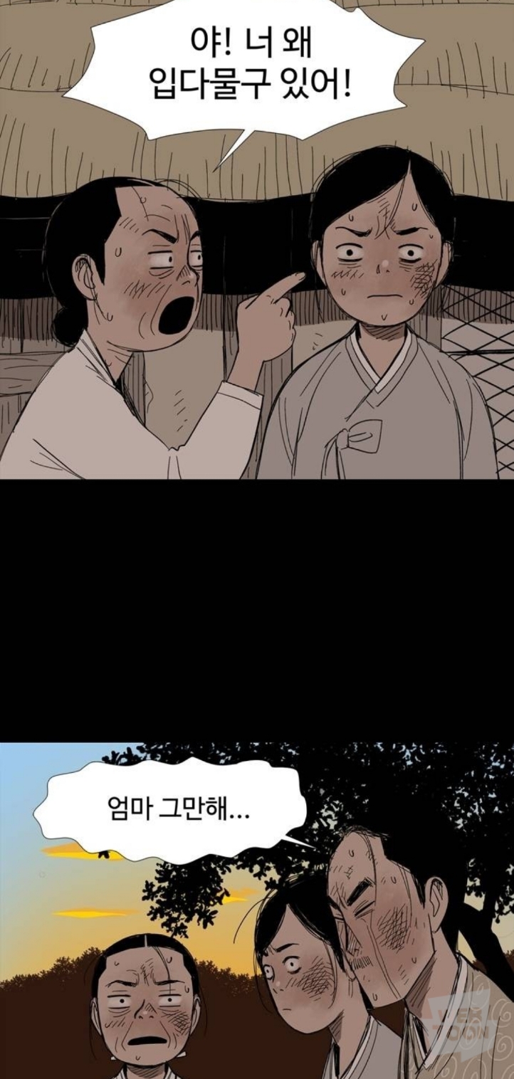 마을에 내려온 북한군에게 밥을 줬다는 이유로 남한군에게 창피당하는 중임