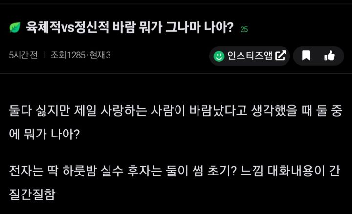 작성자액상과당그만 작성시간 23.04.24 정신적 바람이 나은거같음