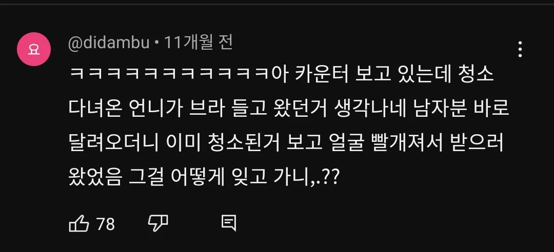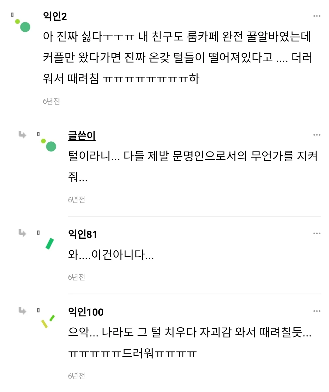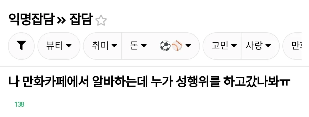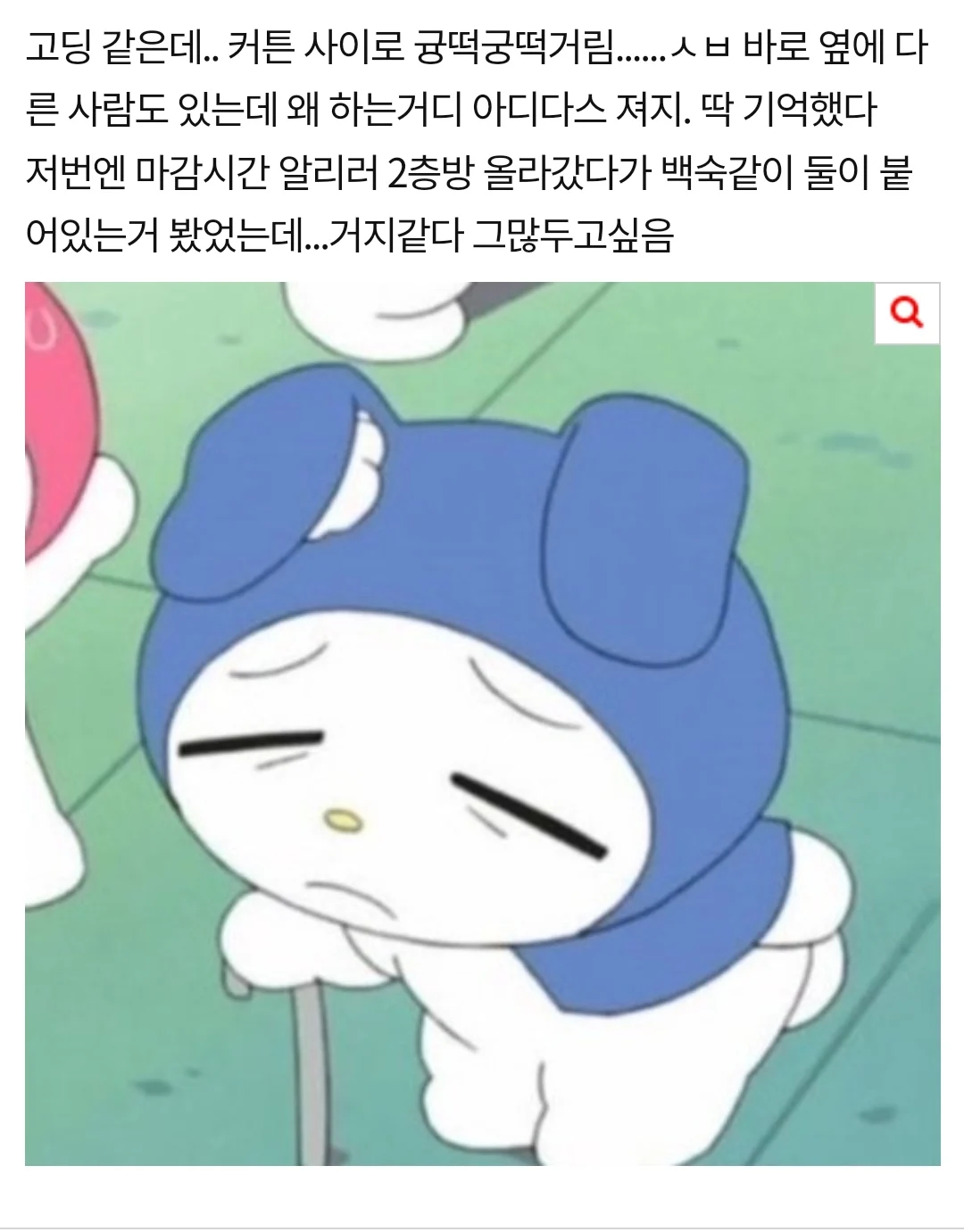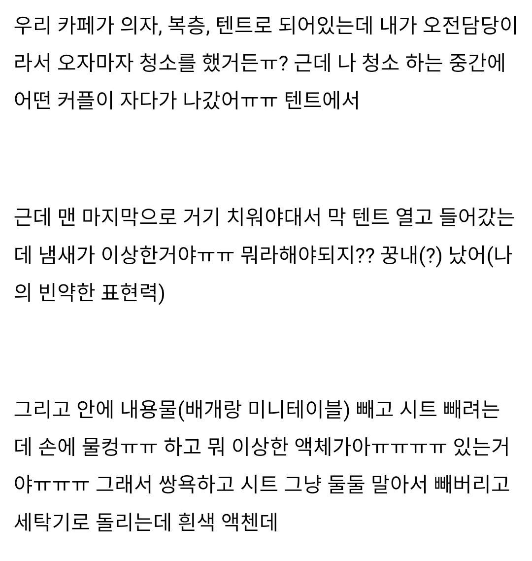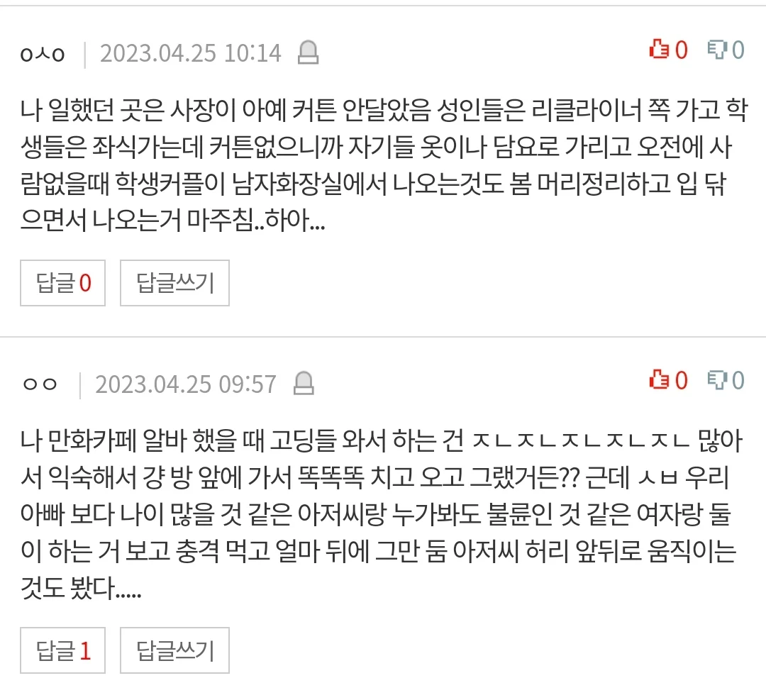 작성자치원 작성시간 23.04.25 아니 룸카페에서 해도된다는건 아니고 룸카페 같이 문이 딱 닫혀있는데도 아니고 커튼 하나면 바로 밖인데.. 어케 하냐..