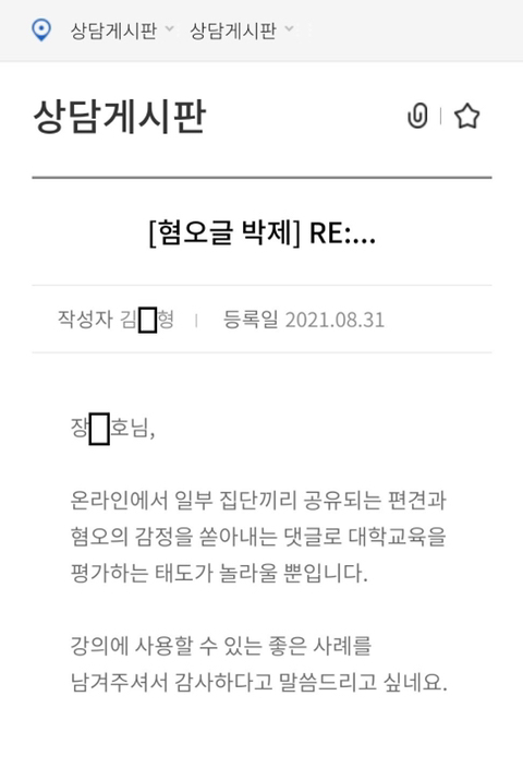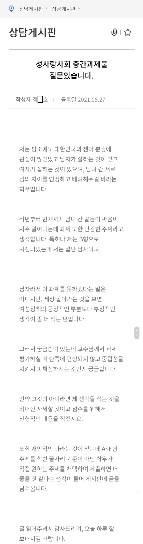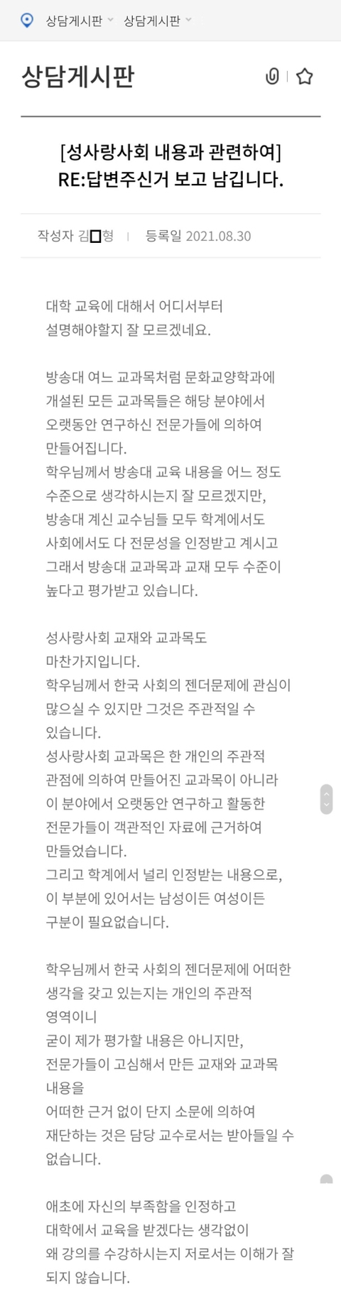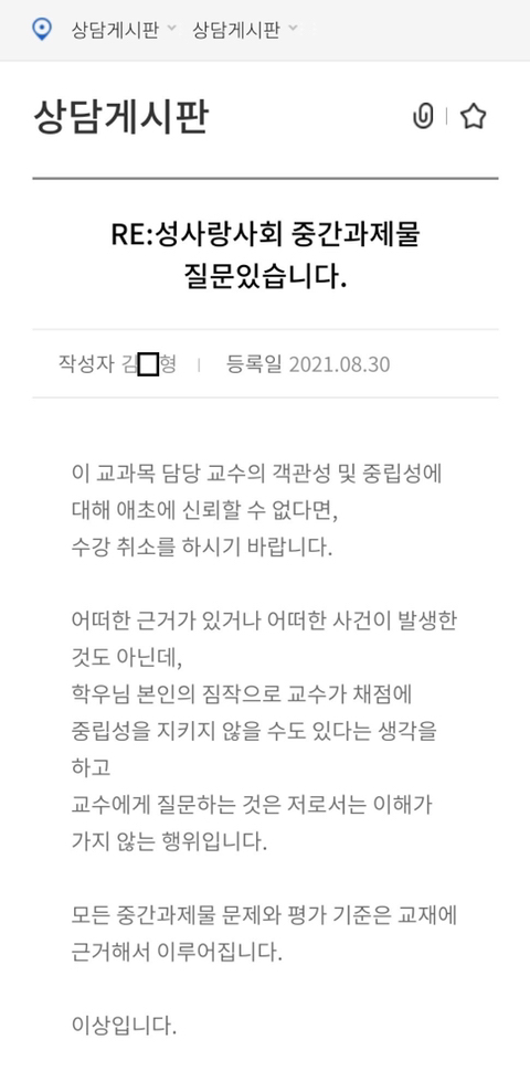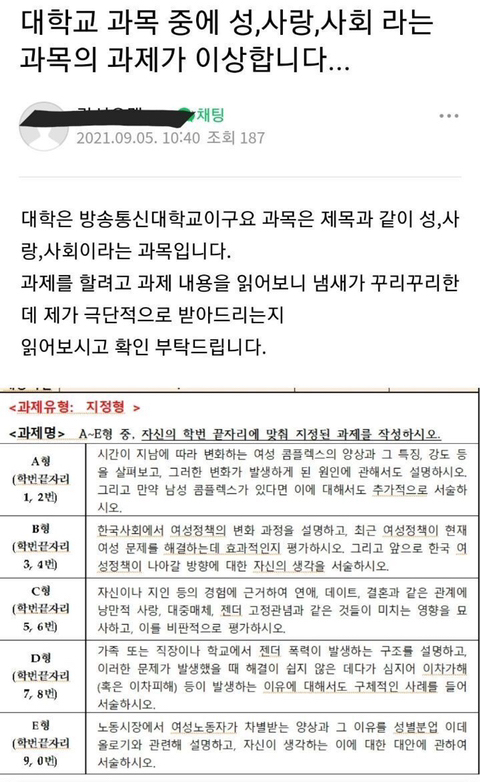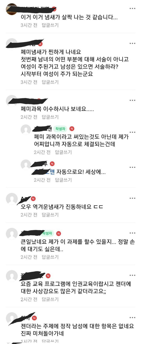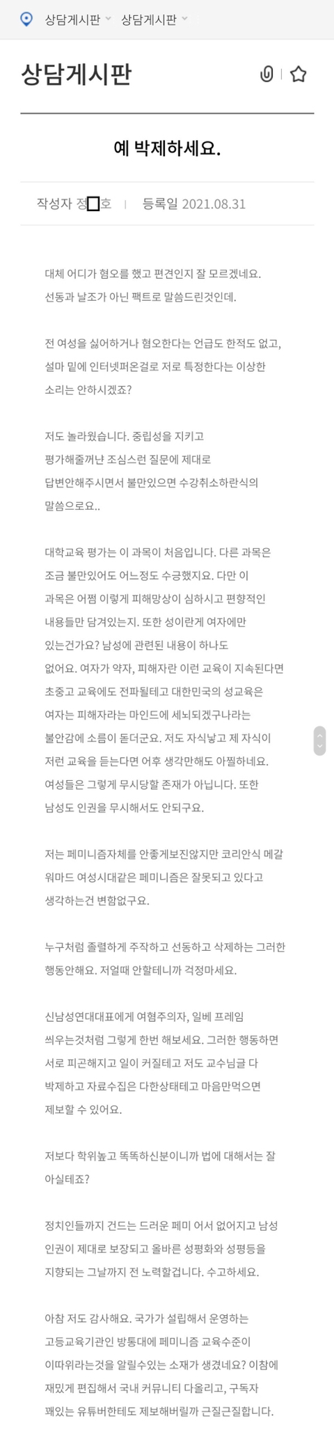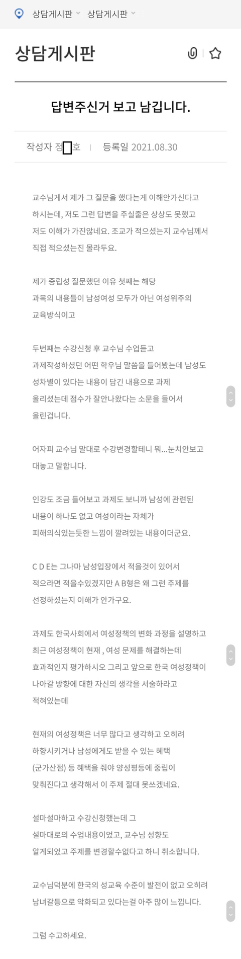 작성자Coejn 작성시간 23.04.28 답변을 강요한것도 아니고 본인 신념이 있으면 꿋꿋이 지 논리대로 펼쳐나갔어도 성적에 영향은 없었을텐데 피해의식아님? 우리학교 여성학강의 교수님도 정답은 없으니까 생각하는 근거만 정확히얘기하라고 하셨는데
