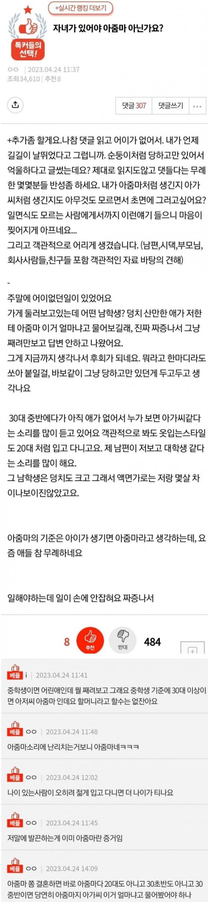 작성자극한ENTP 작성시간 23.04.27 솔직히 남자들이 아줌마라고 뷰르는거 좋은 의미에서는 안쓰잖아 ㅋㅋㅋㅋ