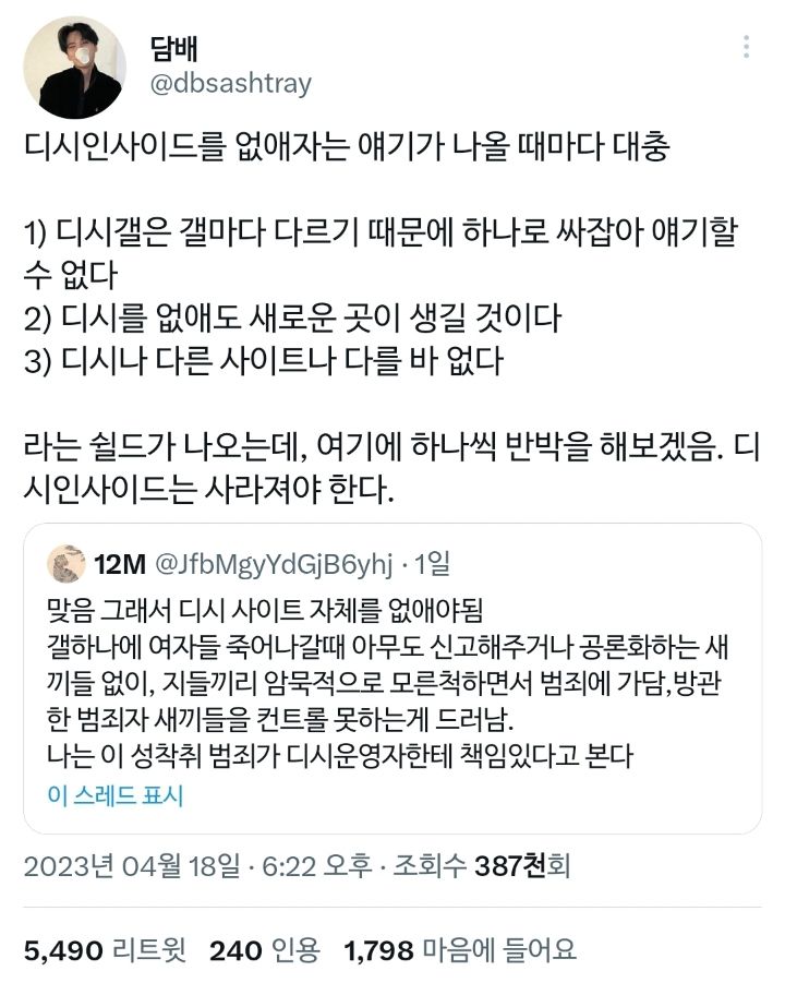 라는 쉴드가 나오는데, 여기에 하나씩 반박을 해보겠음. 디시인사이드는 사라져야 한다. https://t.co/34D2zCkFzn