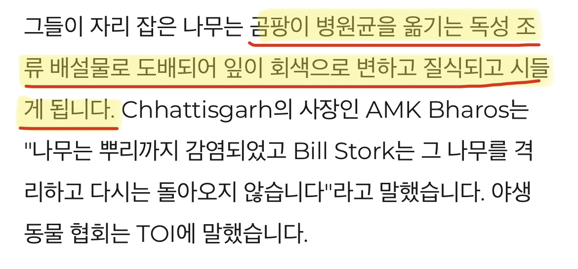 ㄴ 독성이 강한 조류(황새)의 배설물은 나무를