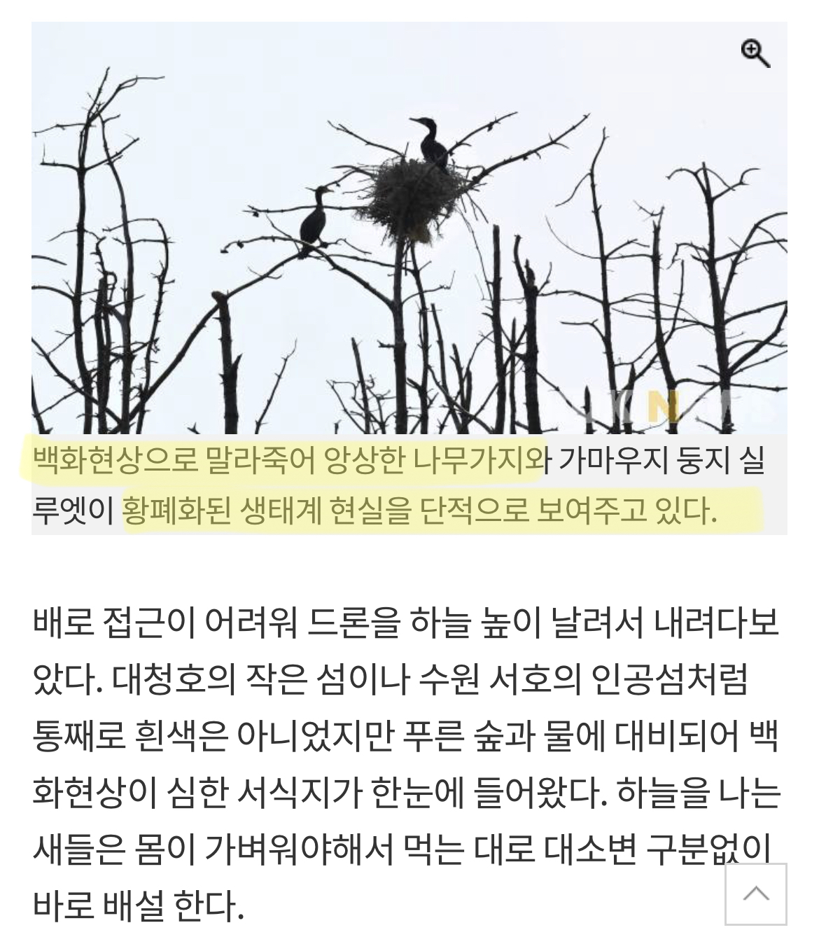 눈 아님.. 섬 전체의 나무가 하얗게 말라 죽은것