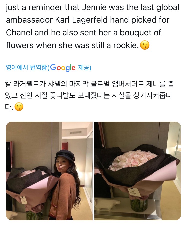 참고로 제니는 칼 라거펠트가 죽기전 마지막으로 직접 뽑은 글로벌 엠버서더라고 함