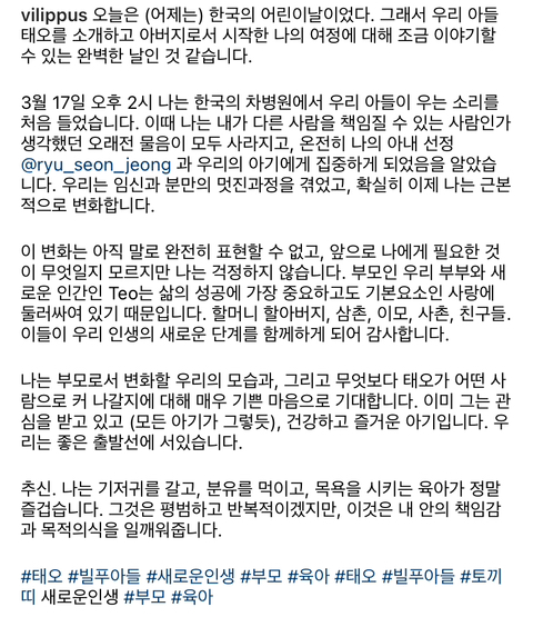 [흥미돋]어서와 한국은 처음이지에 출연한 핀란드 빌푸 근황(아빠 됨) 작성자브라우니와 초코쿠키|작성시간23.05.06|조회수16,002 목록 댓글 11 글자크기 작게가 글자크기 크게가 출처 : 여성시대 브라우니와 초코쿠키https://www.instagram.com/p/Cr5Pc4xNMs43월 17일에 태어났고 이름은 태오래 다음검색 현재 게시글 추가 기능 열기 북마크 공유하기 신고 센터로 신고 댓글 댓글 11 댓글쓰기 답글쓰기 댓글 리스트 작성자긍정킹여새 | 작성시간 23.05.06 헐 애기 겹다 ㅋㅋㅋㅋ축하합니다 작성자키위새새위키 | 작성시간 23.05.06 왤케 빌푸가 출산한덧같지 답댓글 작성자매일하기싫은거하나씩 | 작성시간 23.05.06 그러게 머리도 젖어있고 작성자양파카레 | 작성시간 23.05.06 빌푸 한국에 살고 있었어??? 순산 축하합니다 작성자멘토스레몬맛 | 작성시간 23.05.06 축하해요 빌푸 댓글 전체보기