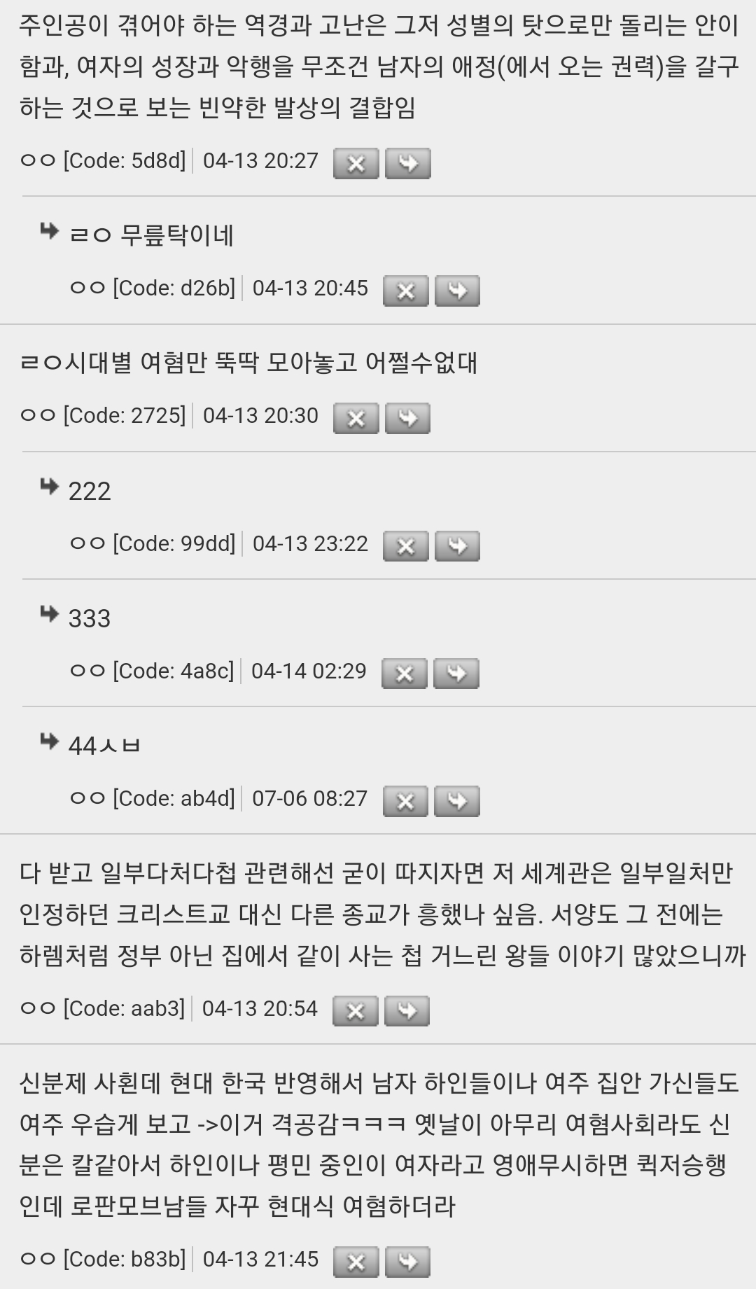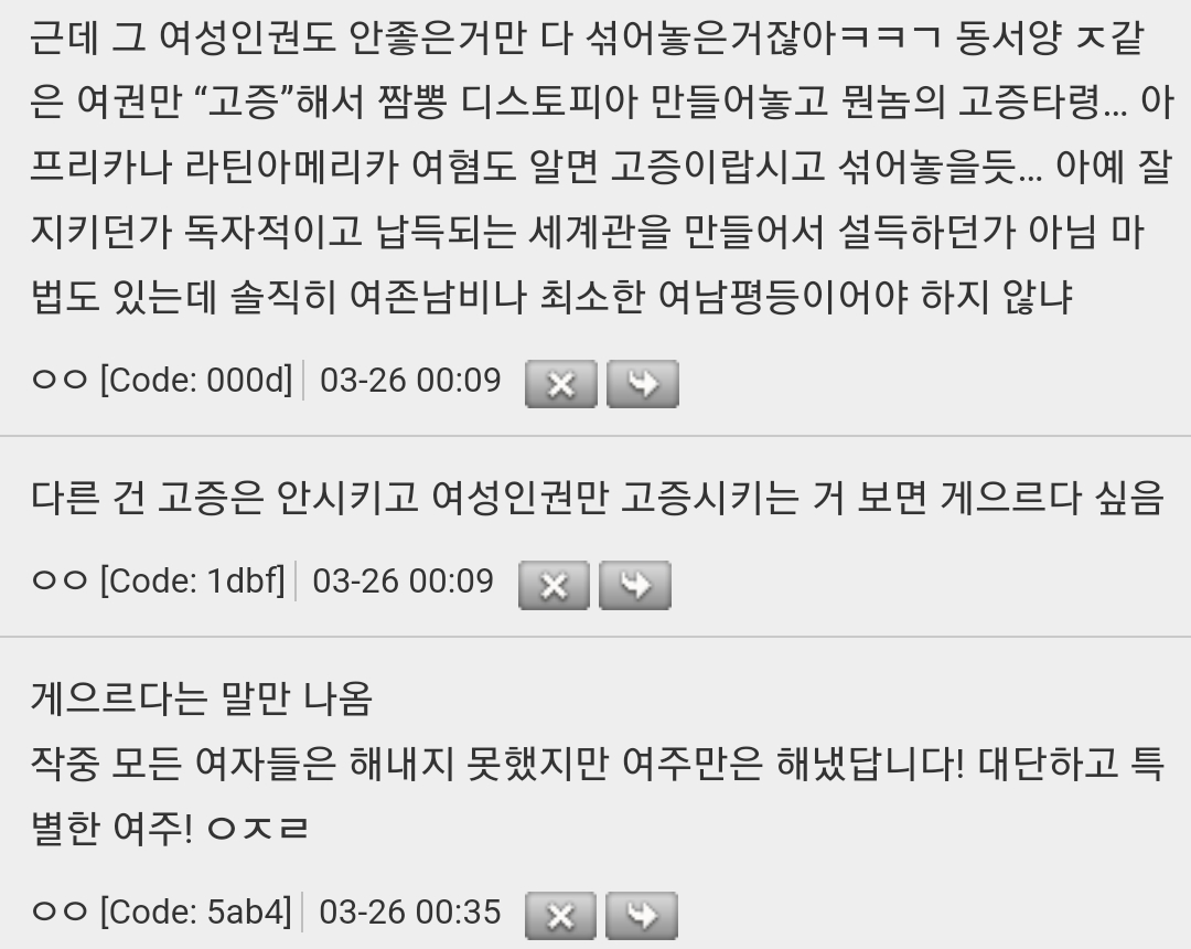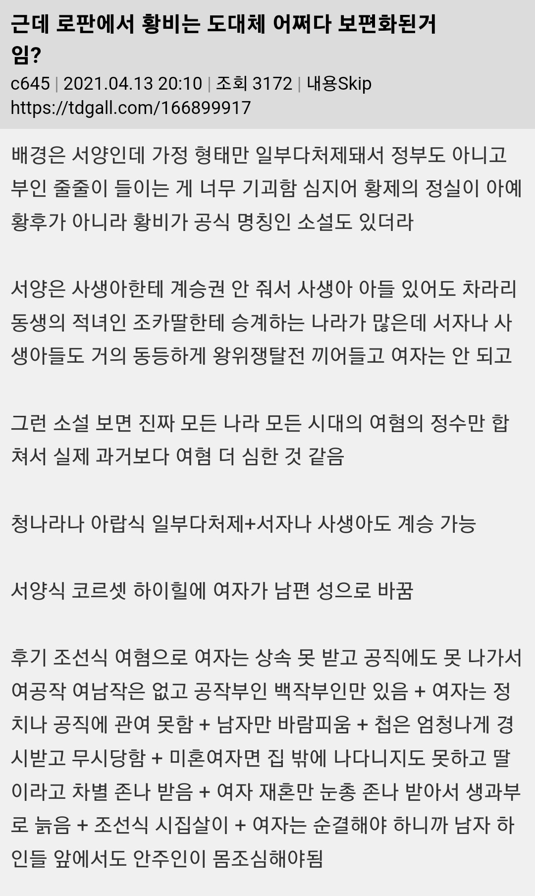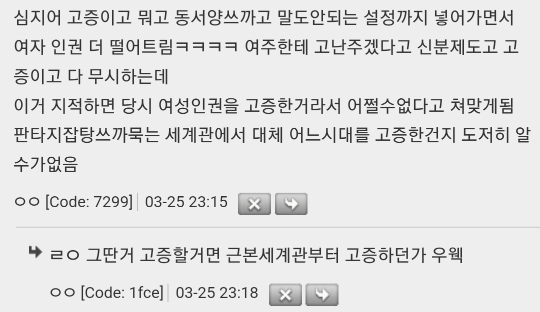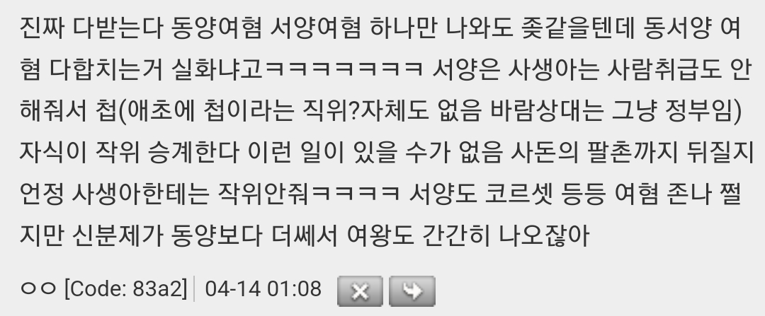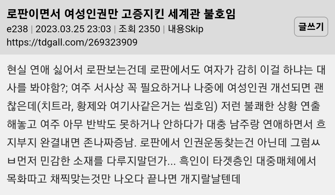 작성자MEMEDd 작성시간 23.05.08 남존여비사회라 남자한테 사랑받는 여주가 권력자가 되고 라이벌 여캐가 팽당해서 천대받는걸 왜그렇게 좋아하는지 알수가없다 난