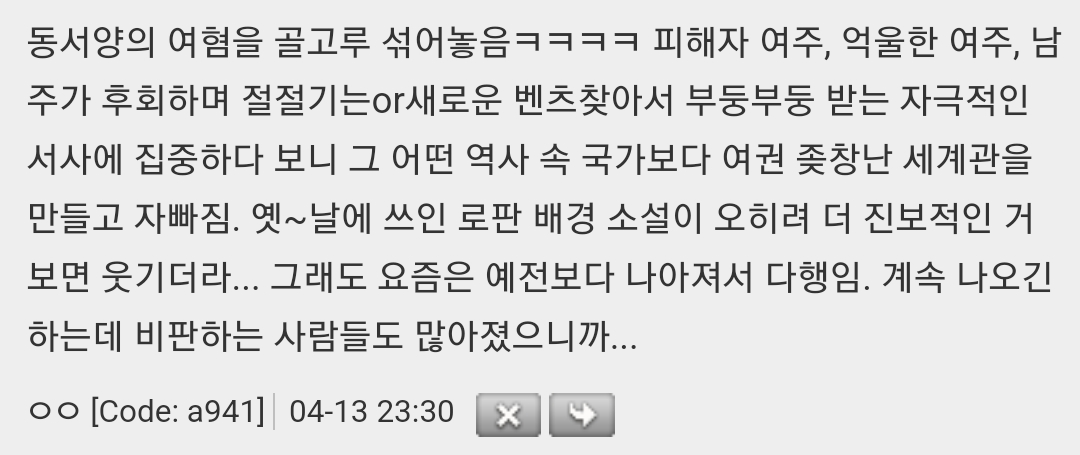 작성자햄토림 작성시간 23.05.08 나도 그래서 진짜 직업있는 여주 로판만 봄 예전에는 아무거나 봤는데 보면서 좀... 아쉬움ㅠ 진짜 극초반에 본 로판들 지금 생각하면 캐나 전개방식이나...아쉽