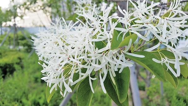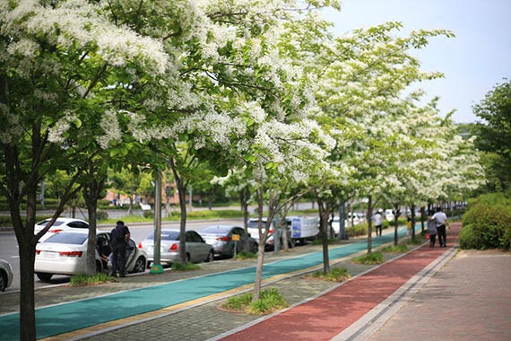 땅바닥부터 하얗게 꽃과 잎사귀로 덮여있음