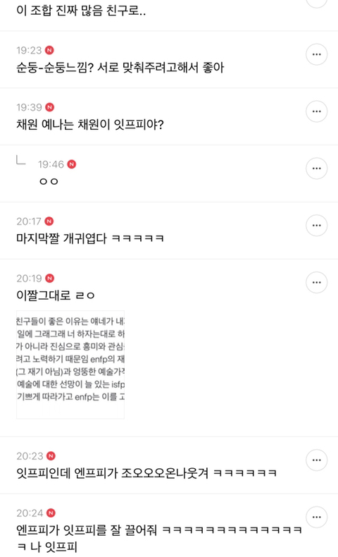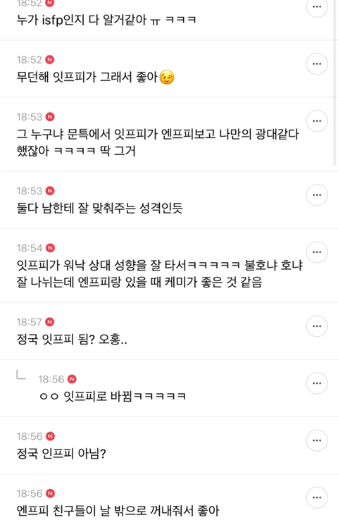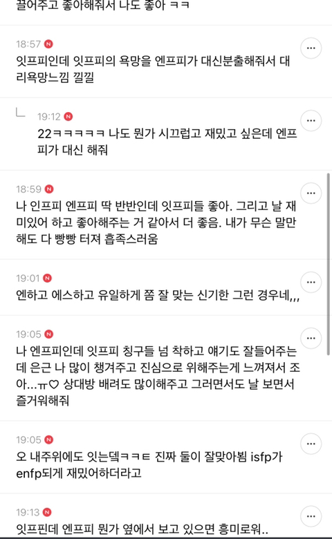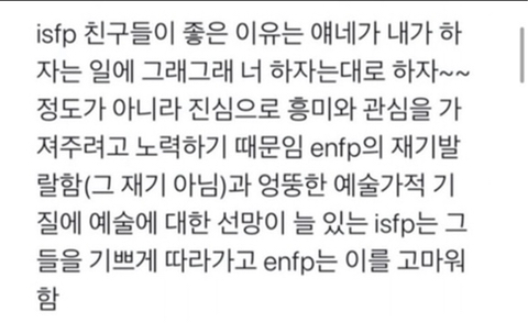 잇프피 엔프피 특유의 좋은게 좋은거지~ 하는 여유롭고 자유로운 fp 성격에 둘다 장난을 좋아해서 (엔프피는 대놓고 잇프피는 은근히) 서로 티키타카가 잘 통하는 편이야