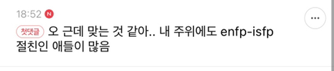 isfp가 s중에 가장 n같은 성향이고 엔프피는 E지만 i스러운 면모가 있어서 어느 정도 성향이 퍼즐처럼 맞춰져 또 상처받는 포인트가 비슷하고 서로한테 타격감 없는 순둥 무해한 대화가 가능 + 장꾸처럼 노는 거 좋아함 등의 이유로 절친되는 경우가 많은듯